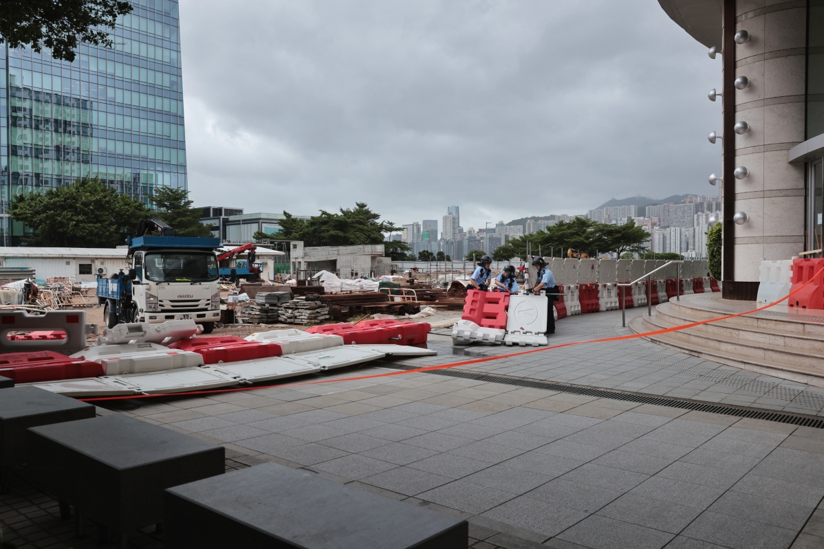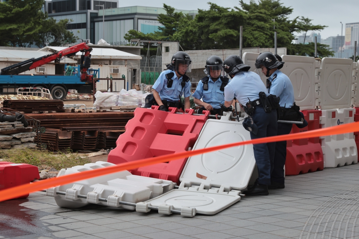 圖為維港海傍一工地有大片圍擋被強風吹倒,警方到場拉起警戒線並嘗試修復圍擋。