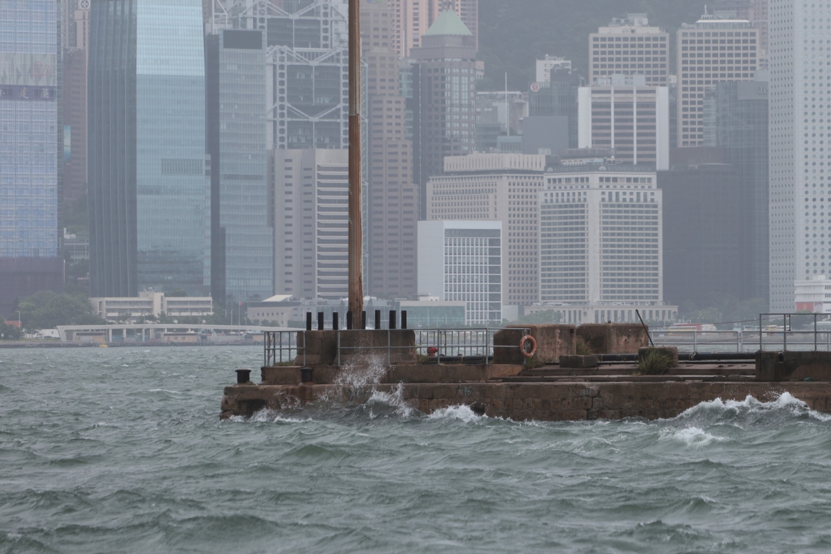 圖為當日香港維多利亞港風大浪大,海浪拍打兩岸激起陣陣水花。