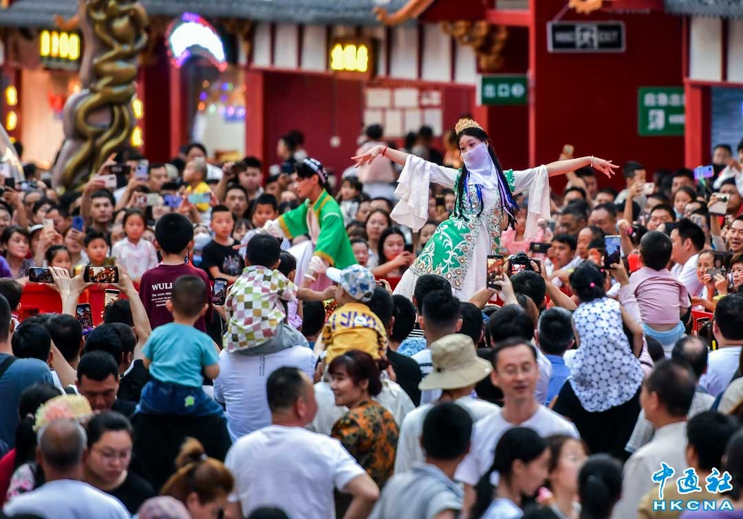 疫情後的第一個夏天,作為旅遊勝地的新疆是實打實火了。據央廣網7月9日報道,自6月25日以來,新疆機場單日旅客吞吐量持續保持在13萬人次以上,7月6日起單日旅客吞吐量持續超過14萬人次,至7月8日首次突破15萬人次大關,與2019年同期相比,架次、人數增長增幅分別為8.28%、28.91%。圖為7月4日,民眾在新疆烏魯木齊市的天山明月城內休閑娛樂。 香港中通社圖片