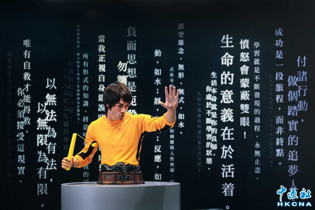 7月11日,“李小龍 — 經典永續”展覽在香港文化博物館舉行新聞界預展。香港文化博物館將於7月12日至明年1月1日舉行“李小龍 — 經典永續”展覽,展出一系列以李小龍為題的流行文化珍藏,包括書刊、紀念郵票、手辦模型等。圖為李小龍1:1矽膠半身像。 (香港中通社記者 許其皓攝)