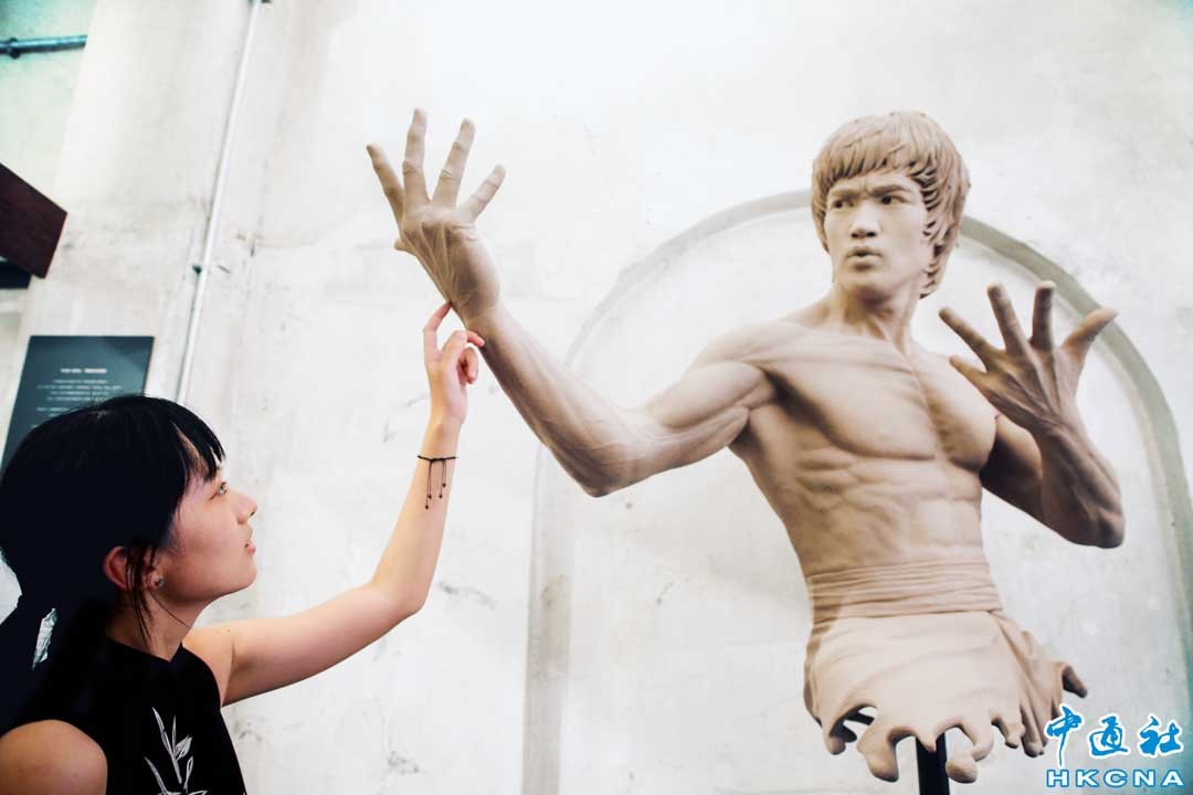 7月14日,嘉賓在預展上觀賞李小龍雕塑。今年7月20日為一代巨星李小龍逝世50週年,香港李小龍會與香港著名創作人馬富強合作,於7月15日至7月30日,假座深水埗“大南天梯”展覽空間舉行《李小龍·光輝50 - 馬富強作品致敬展》,向李小龍致敬。 (香港中通社記者洪少葵攝)
