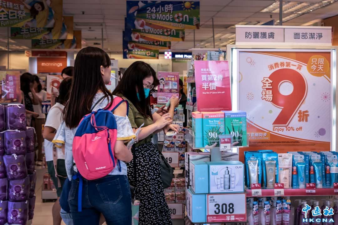 7月16日,香港特區政府發放今年第二期電子消費券,約650萬人受惠。圖為不少商家為響應消費券的派發,推出優惠吸引市民消費。 (香港中通社記者 謝光磊攝)