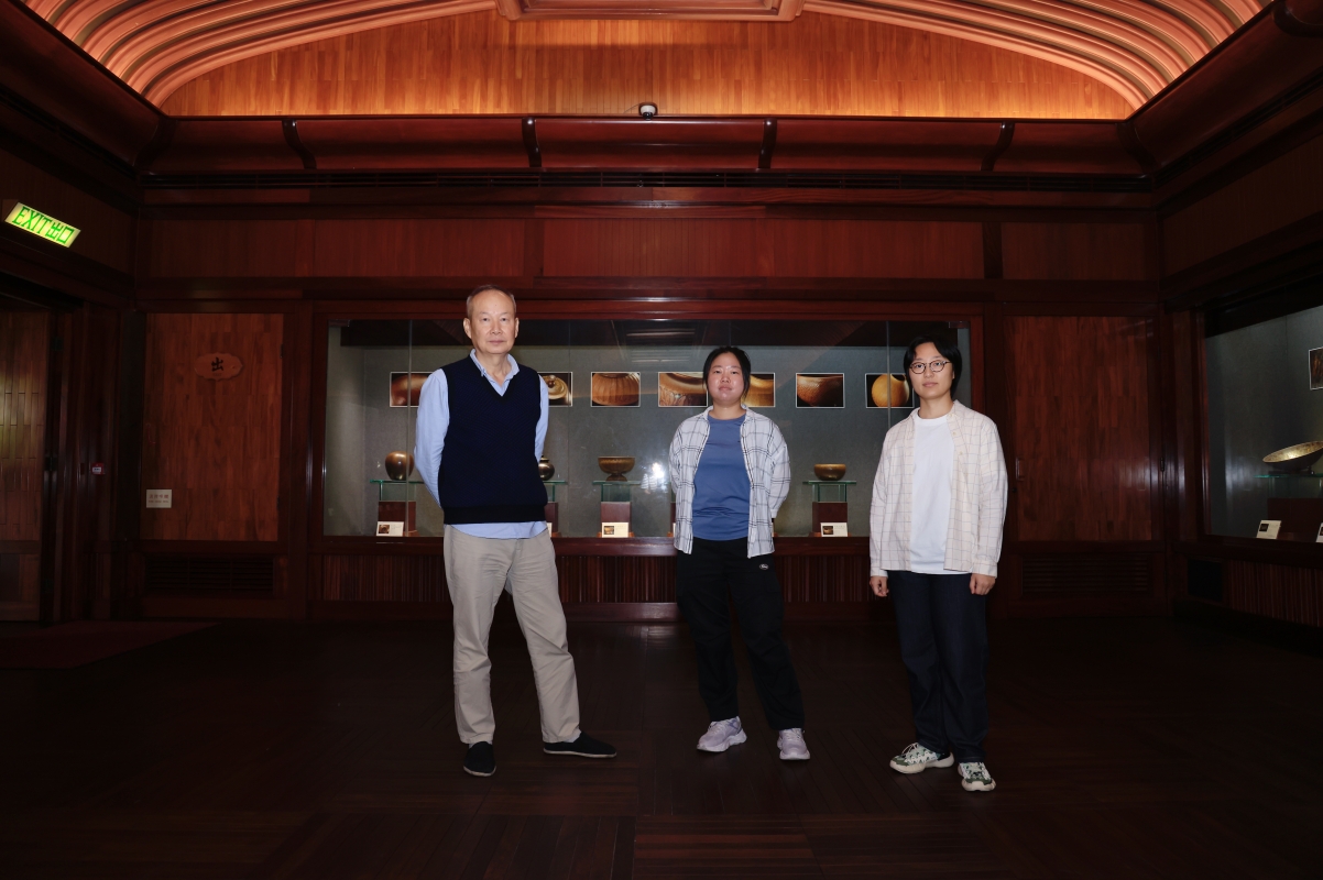 陶瓷藝術家高峰(左)與兩位弟子鮑祈茗(右)、侯夢露(中)在作品前
