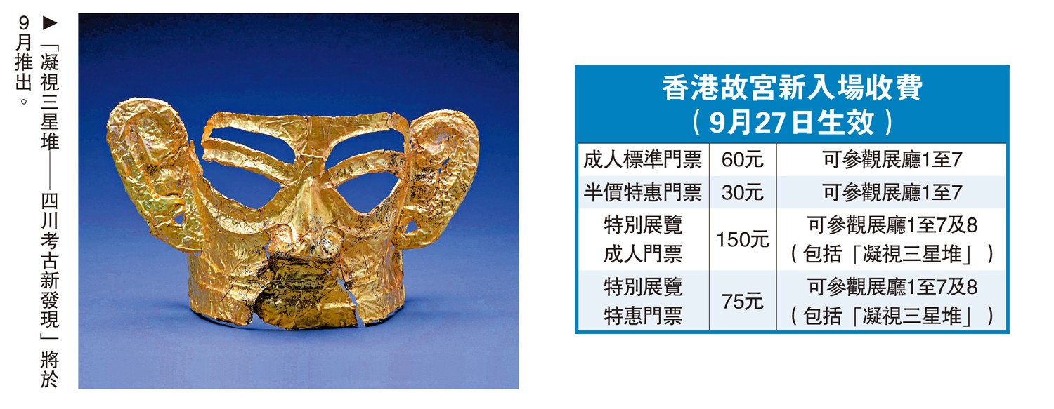 香港故宮9·27起門票加價10元 三星堆特展門票150元香港新聞網7月26日電 香港故宮文化博物館踏入營運第2年,將更新博物館的常設專題展覽,並繼續為觀眾帶來全新的特別展覽,包括今年下旬推出的“凝視三星堆——四川考古新發現”(下稱“凝視三星堆”)和與英國國家美術館合辦的兩大特展。館方同時宣布由9月27日起調整標準門票的入場門票收費,並公布“凝視三星堆”特別展覽票價。