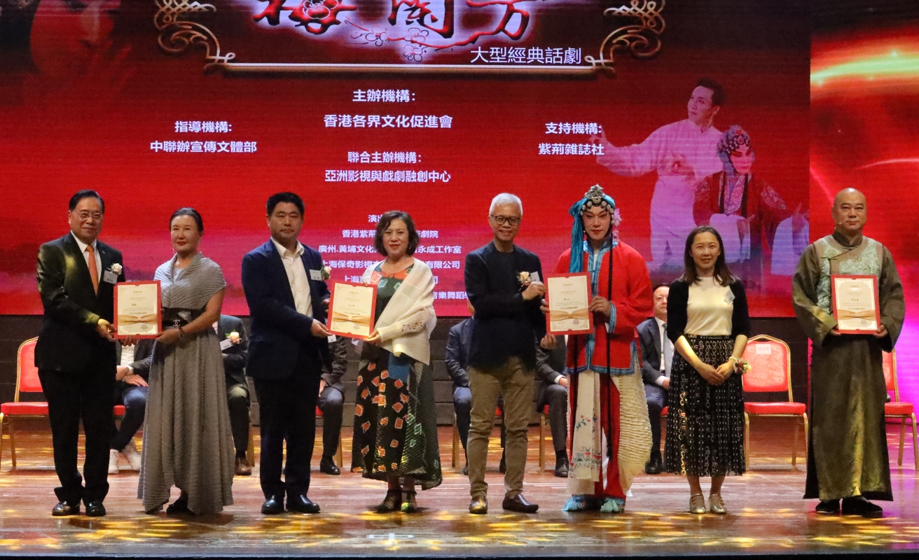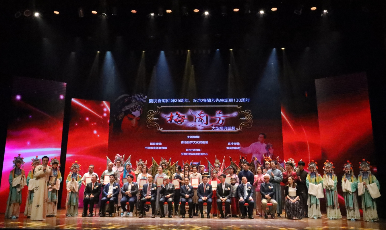 紀念梅蘭芳先生誕辰130周年 暨大型話劇《梅蘭芳》專場演出香港新聞網7月30日電(記者洪少葵)適逢香港回歸祖國26周年,紀念梅蘭芳先生誕辰130周年,香港各界文化促進會於7月29日至30日在香港北角新光劇院大劇場主辦大型舞台劇《梅蘭芳》專場演出。該劇由京劇藝術家梅葆玖生前與香港著名導演吳思遠聯合打造,著名影視劇導演、國家一級演員白永成領銜主演。以多媒體技術手段將話劇和京劇、舞蹈等藝術熔於一爐,展現一代京劇大師梅蘭芳的傳奇一生。演出所到之處好評如潮,並榮獲第十一屆中國戲劇節優秀劇目獎。 7月30日,香港署理文化體育及旅遊局局長劉震,全國人大代表、香港藝術發展局主席、立法會議員霍啟剛、全國政協委員、香港各界文化促進會主席涂輝龍、中聯辦宣傳文體部副部長張國義、立法會議員馬逢國等文化藝術界代表蒞臨主持開演儀式。 為紀念兩位梅派大師,上海保奇影視把梅葆玖先生生前與香港導演吳思遠先生聯合打造的大型經典舞台劇《梅蘭芳》搬上大區舞台,把一代京劇大師梅蘭芳先生的一生濃縮在方寸舞台上,深情的講述了近半個世紀時代變遷下的伶人往事。 香港各界文化促進會參與出品的大型經典舞台劇《梅蘭芳》由著名影視劇導演、國家一級演員白永成領銜主演。作為梅葆玖先生行外唯一的關門弟子,主演白永成表示:“梅葆玖老師生前多次表示希望把這個劇保留下來,傳承下去,我不能懈怠,何況現在已經是老師的遺願!我期待不同的觀眾都能在舞台劇《梅蘭芳》中找到自己的故事。因為觀看的同時不是解讀歷史,而是充滿著想像的戲劇空間。每位觀眾都可以有各自敘事的觀點,進而發展專屬於自己的戲劇文本”。 本次《梅蘭芳》複排呈現,也藉此回應梅蘭芳先生的“變才有進步”的創作理念,在舞台上,用巨大的LED螢幕和現代化冰屏,頻繁呈現著梅蘭芳先生不同時期的劇照和上世紀三十年代他出訪美國的實況記錄,用紀實影像呼應舞台表演,用誠心與誠意告慰兩位京劇大師,讓京劇藝術跨越了世代,在此召喚永續。追宗師梅蘭芳千古絕唱,憶大師梅葆玖禮花綻放。讓廣大觀眾近距離感受為中國與世界文化做出卓越貢獻的戲曲大師。