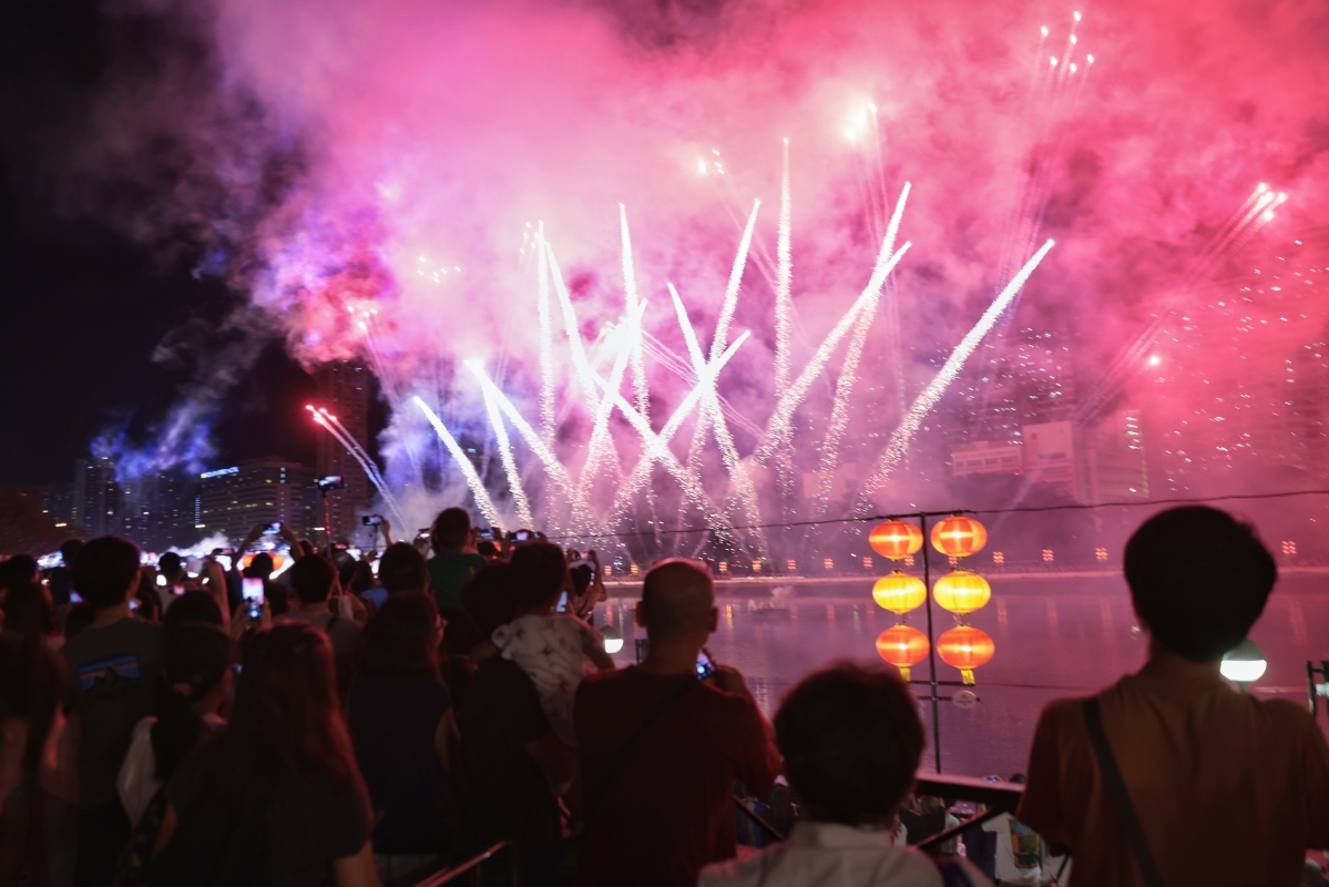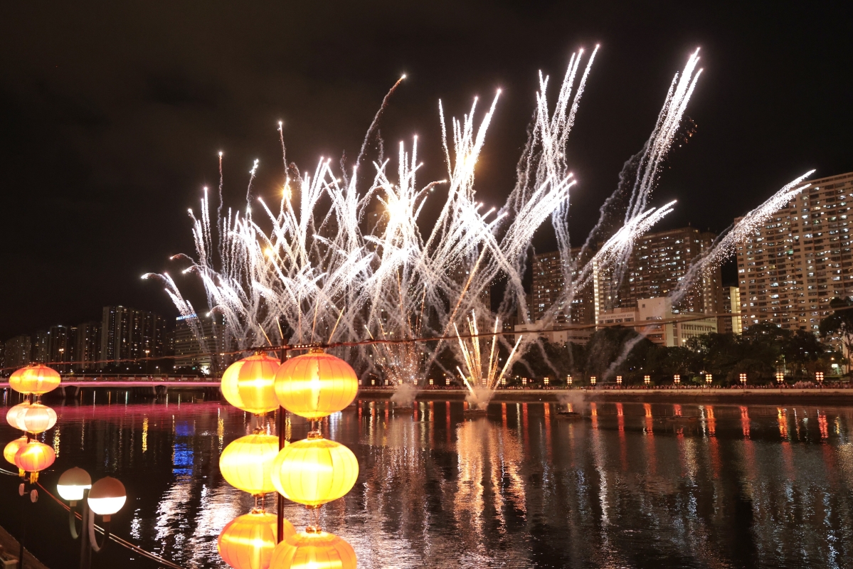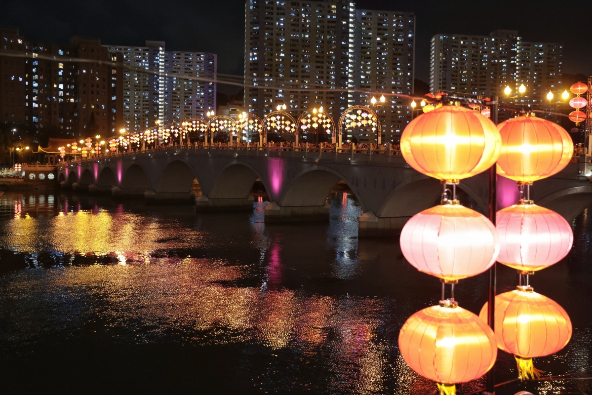 圖為沙田城門河畔瀝源橋一帶張燈結彩,現場人頭湧湧,氣氛熱鬧。