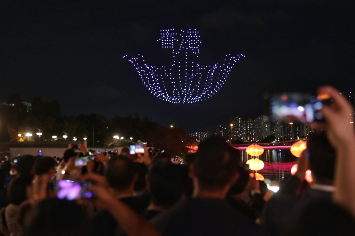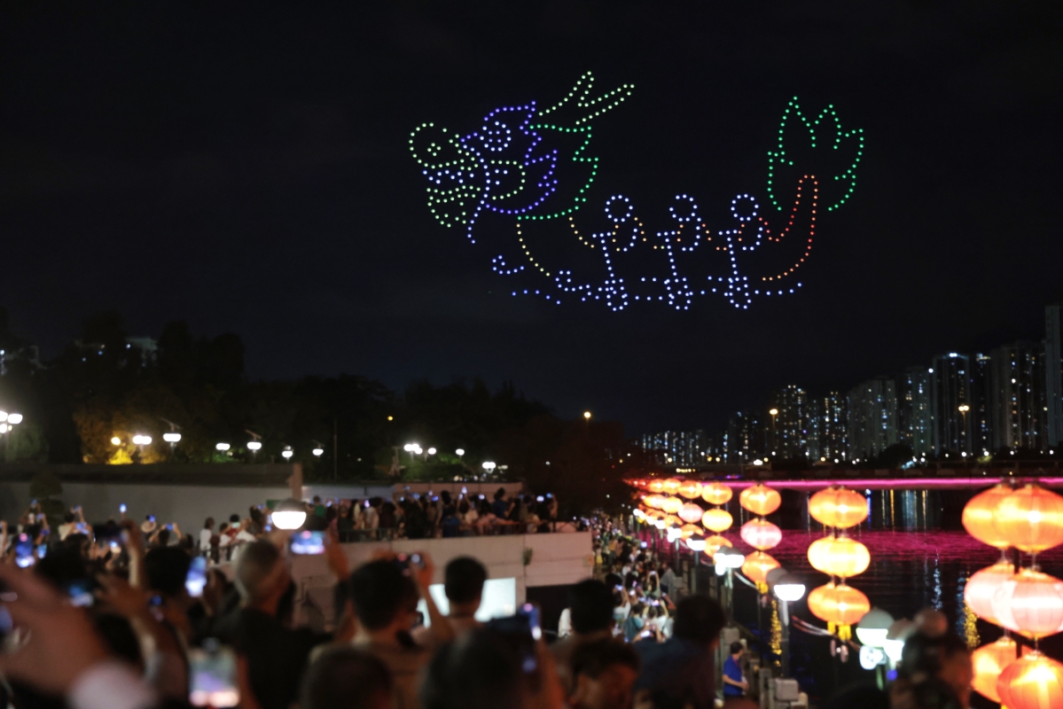 圖為大批市民在城門河畔瀝源橋一帶欣賞無人機表演,無人機在空中組成龍舟圖案。