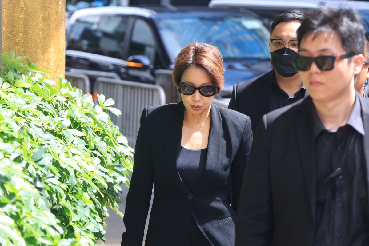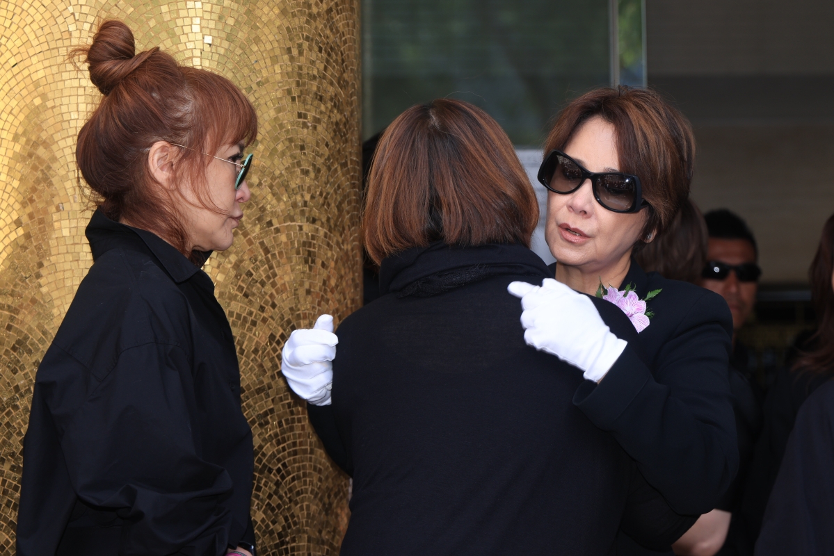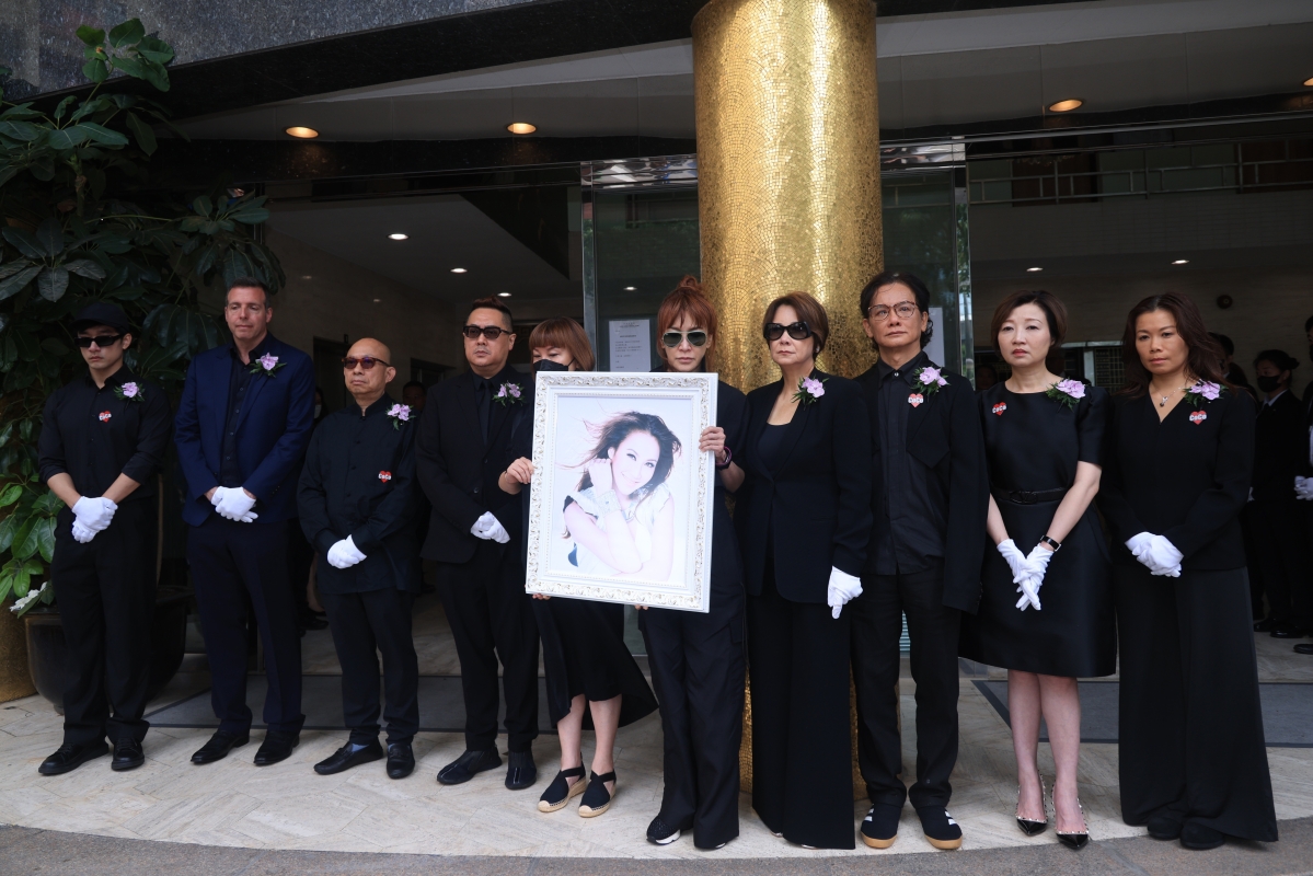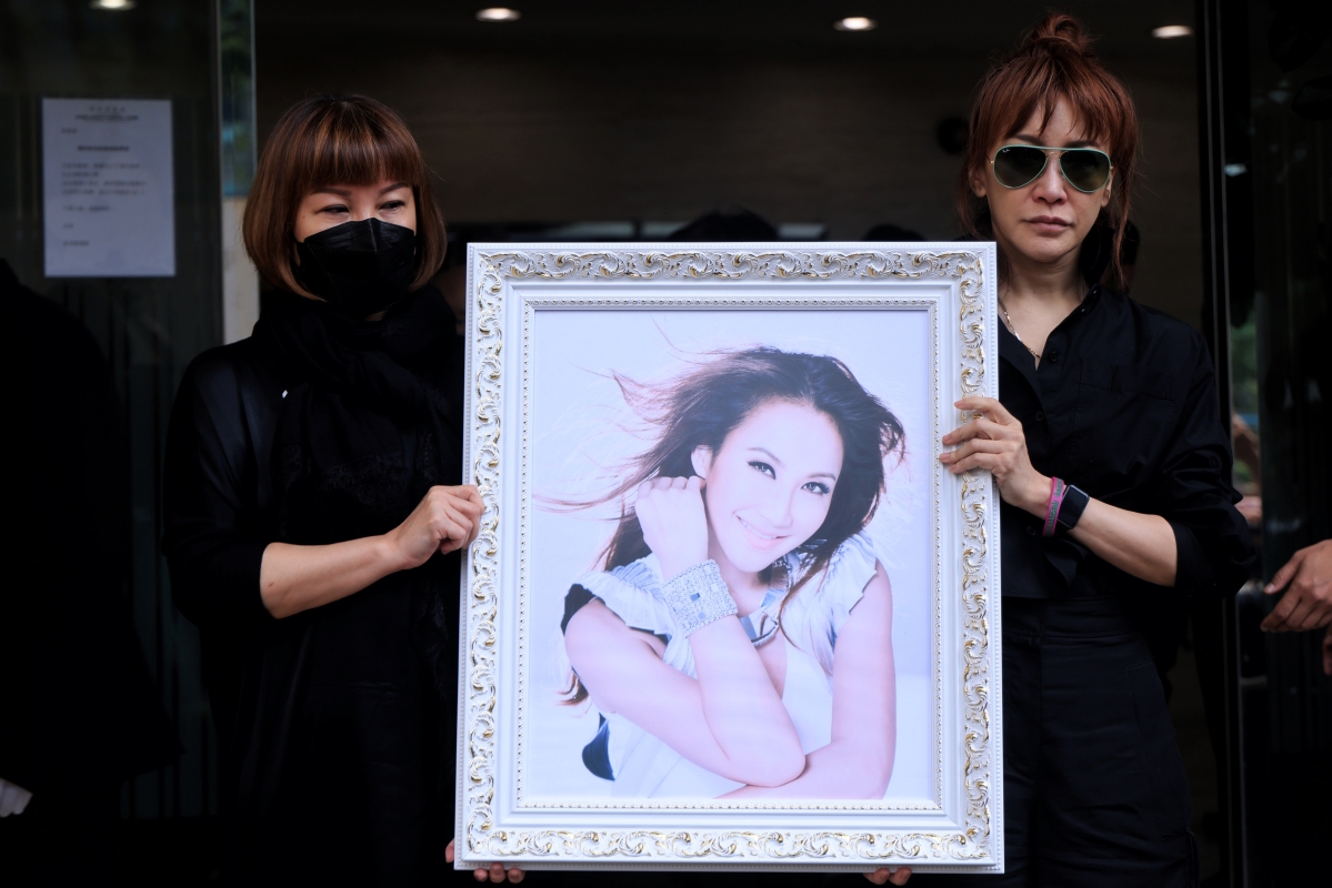 李玟的大姐李秋林和二姐李思林手捧李玟的遺像與親友步出殯儀館
