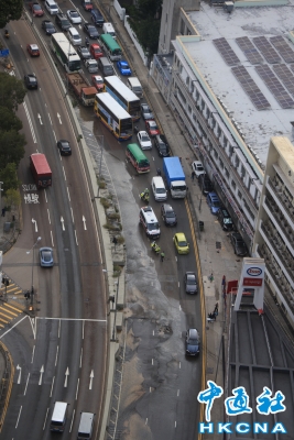 香港新聞網8月7日電(記者洪少葵)8月7日中午,香港黃竹坑道正封閉搶修,警方在現場疏導車輛改道。黃竹坑道往香港仔隧道方向近甄沾記大廈當天凌晨4時許有食水管爆裂引致路陷,受影響巴士路線要改道行駛。運輸署總運輸表示,中西區、香港仔及西九龍一帶的交通,今早先後因為交通意外和水管爆裂,而非常擠塞,西區海底隧道往香港方向,一度要實施間歇封閉。