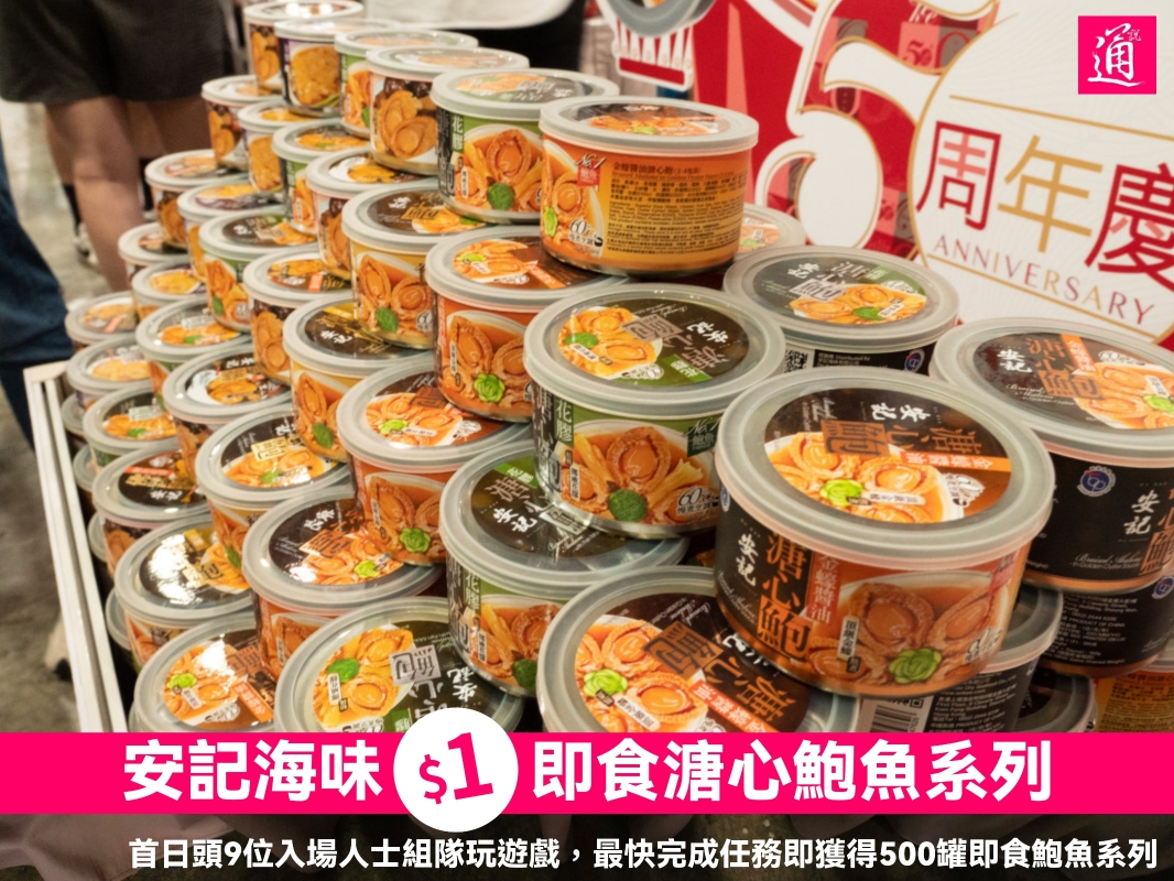 展會首日頭9位入場人士組隊玩遊戲,最快完成任務即獲500罐安記即食鮑魚。