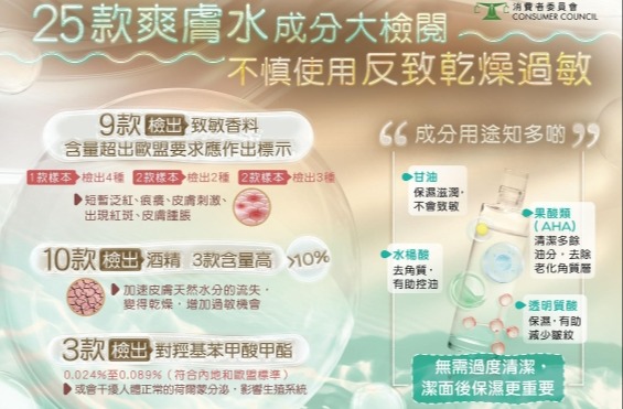 消委會圖片。 消委會指,不少樣本亦標示添加了香料和酒精,前者用作遮蓋頭髮的異味,而後者幫助分散吸附劑,並有溶解油脂和去除異味的功效。樣本中,逾6成(13款)標示含有變性酒精/酒精,相關成分亦普遍列於成分表中較重要位置,反映使用濃度較高。有海外資料顯示,免沖水洗髮產品的酒精濃度最高可達30%。接觸較高濃度的酒精有機會破壞皮膚天然的油脂保護屏障,如果頭髮的油脂被過度去除,可能令頭髮變得乾燥欠光澤。所有調查樣本中有14款標示含有香料,當中11款標示含1至8種香料致敏物質,2款樣本分別標示含有7至8種香料致敏物,對香料或相關香料物質有過敏反應的人士應特別留神。 此外,有5款樣本欠標示詳細成分資料,消費者無法從標籤辨識產品是否含可致敏的成分。美國國家毒物中心認為,免沖水洗髮用品普遍含有香料、表面活性劑和防腐劑,若經呼吸吸入,有機會令某些人士的呼吸道造成刺激,如果在密閉空間內使用,更可能引起咳嗽,甚至出現呼吸困難。消委會建議生產商改用較安全和環保的原材料製造產品,並加強品質監察,盡量降低產品可能含有或釋出有害物質的可能性。(完) 【編輯:孟宜君】