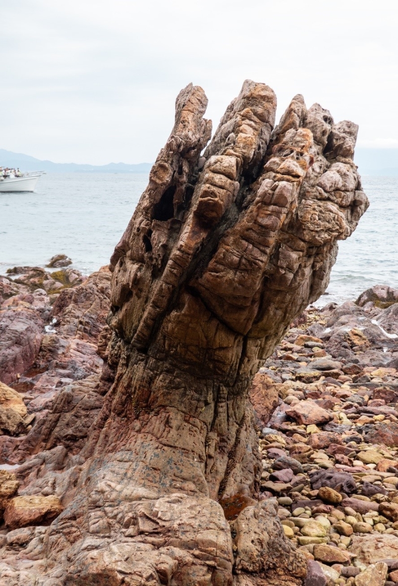 香港新聞網9月5日電 香港地方志中心配合《香港志·自然》出版,邀請專家學者以歷史、自然及人文價值為基礎,提名30個香港自然景觀入圍,供全港市民及遊客以網上投票方式,投選出最具代表性的“香港自然十景”。香港中通社香港新聞網推出“美麗香港”欄目,為讀者逐一介紹自然三十景,本期介紹黃竹角咀摺曲構造。 黃竹奇石是黃竹角咀的海岸線一系列因地殼運動而形成的斷層和摺曲構造,該地區的岩石包括泥盆紀的沉積岩、中生代的火山岩和紅色岩層。黃竹角咀東端的岩石主要是石英質的砂岩和粉砂岩組成,岩層經歷地質運動,加上岩層的抗蝕力強,在海邊形成一系列垂直板狀的岩層。海浪沿著岩層侵蝕形成各種不同的形態,當中最著名的是如魔鬼之手的鬼手岩、鬼面、鷹嘴石等。