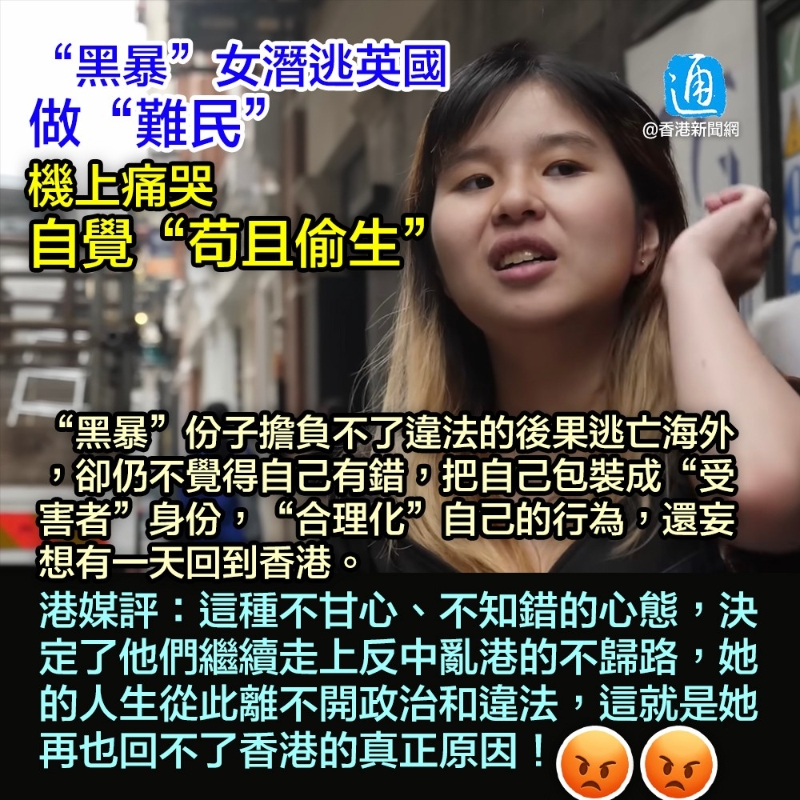 香港新聞網8月16日電 潛逃英國的激進“黑暴”份子Venus,曾是一名香港中文大學學生,“修例風波”期間參與“黑暴”活動險些被捕。她事後死性不改,持續在校內宣揚“港獨”,最終被校方舉報至警方國安處。 Venus因害怕被捕後要坐牢,情急之下買機票離港潛逃英國,連家人都不知情。她更在離港的飛機上崩潰痛哭,直言覺得自己“苟且偷生”。