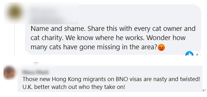 快餐店老闆留言 事件引發英國網友熱議。有英國網友指難怪當地最近多發貓咪失蹤案件,懷疑港人想要偷貓煮來吃。亦有英國網友將矛頭直指香港BNO移民……