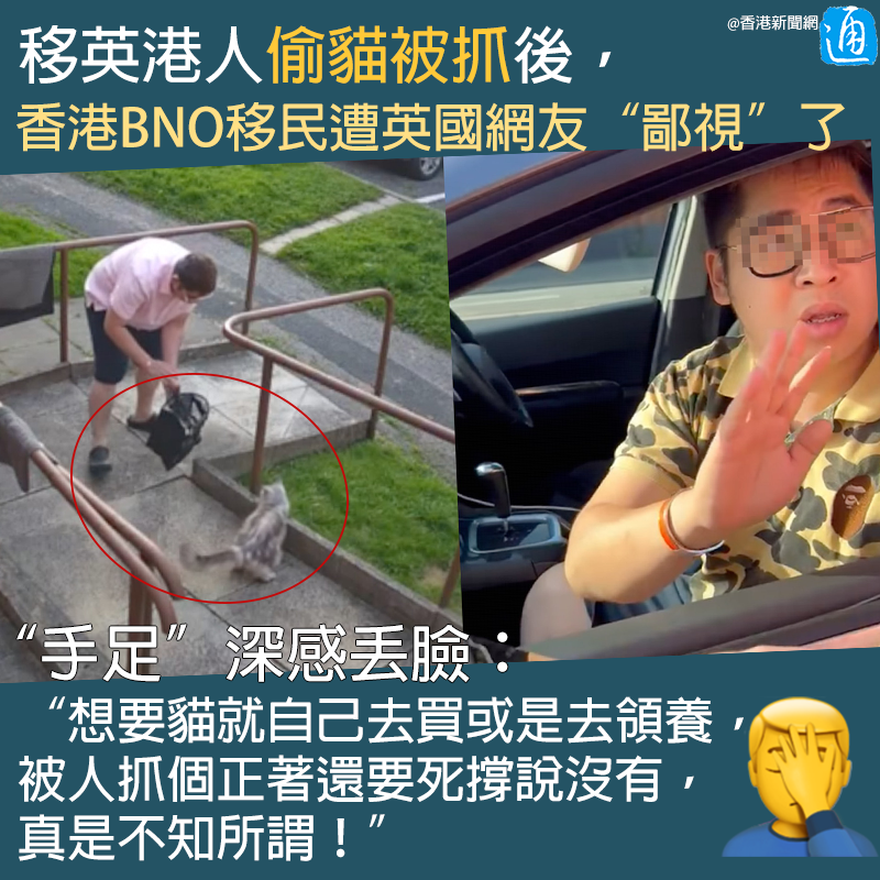 香港新聞網8月23日電 部分“黃絲”移居國外後鬧出不少醜聞。近日網絡瘋傳一段疑似港男在英國曼徹斯特偷貓被抓的影片,讓“手足”深感丟臉! 近日,有英國曼城居民在社交平台Facebook上貼出近10段影片,揭露港男疑似偷貓的過程。影片中可以看到,一名身穿粉色短袖襯衫的男子在停車場先以食物誘貓,再將貓咪逼向死角,之後他打開一個黑色袋子,試圖將貓裝入袋內,但貓咪大力掙扎,敏捷逃走。男子誘捕貓咪的計劃最終宣告失敗。 但該男子萬萬沒想到的是,自己試圖帶走貓咪的過程被監控拍了個正著。貓咪的英國主人其後與朋友一起帶著監控畫面,到該港男工作的快餐店與他對質。 “Is this you?(這是你嗎?)”貓主朋友向港男出示監控畫面,不停質問 “Why you trying to rob the cat?(為什麼要偷貓?)” 坐在車上被質問的男子則眼神飄忽,試圖狡辯稱 “It's not me.(那不是我)”“I don't steal your cat.(我沒有偷你的貓)”。貓主則站在車前,以防汽車開走,並手拿電話準備報警。 該港男的快餐店同事見狀出門查看,並用廣東話問他:“你是不是真偷了他的貓?”港男起初否認,稱“我沒有偷貓,我只是餵它”。當得知貓主報警後,港男開始慌亂,擔憂地詢問同事自己會不會坐牢,並和同事商量遇到警察後該如何作供,“我怎麼和警察講?可不可以跟他講,我想捉流浪貓回去養?” 眼見事情無法“輕輕放下”,港男還“委屈”地表示,“我真的沒拿到(貓)啊”。同事則回應說,“問題是你想拿,你明白嗎?” 爭論期間,快餐店老闆亦出門了解情況,似即場解僱港男。最後,警員亦到場將港男帶上警車,到警局進一步調查。事後,快餐店老闆在有關帖文內留言,表示涉事男子是持BNO簽證的香港人,為其店內兼職司機,已被解僱,並澄清事件與該店無任何關係。