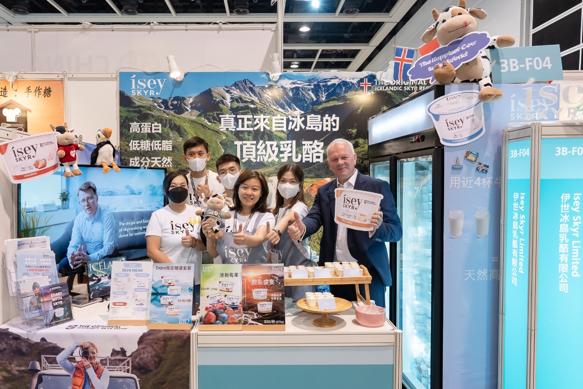 Illugi Gunnarsson(右)專程由冰島飛來香港,巡視美食博覽展位。(圖片:受訪者提供) Gunnarsson告訴香港新聞網,此次進軍香港也頗為看好香港乳酪零售業的發展前景。根據全球市場調研公司歐睿國際(Euromonitor International)發布的數據,由2021年至2026年,香港乳酪零售額將年均增長4.7%,達到13億港元(約1.67億美元),遠高於2017年至2021年的1.9%的年均增長率。目前香港各大超級市場裡已有不少品牌的冰島乳酪銷售,Ísey Skyr如何在眾多品牌中脫穎而出?Gunnarsson表示,他樂見眾多乳製品公司開始生產冰島風格的乳酪,並期待與這些品牌競爭。而Ísey Skyr擁有90多年製造冰島乳酪的經驗,“就像香檳,香檳是氣泡酒的一種,但並非所有氣泡酒都能被稱為香檳。真正的香檳只有一種。Skyr也是如此。”