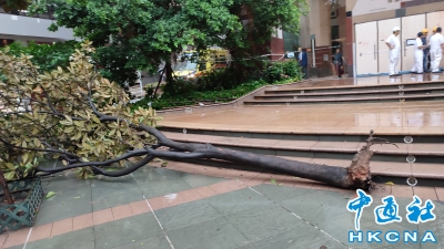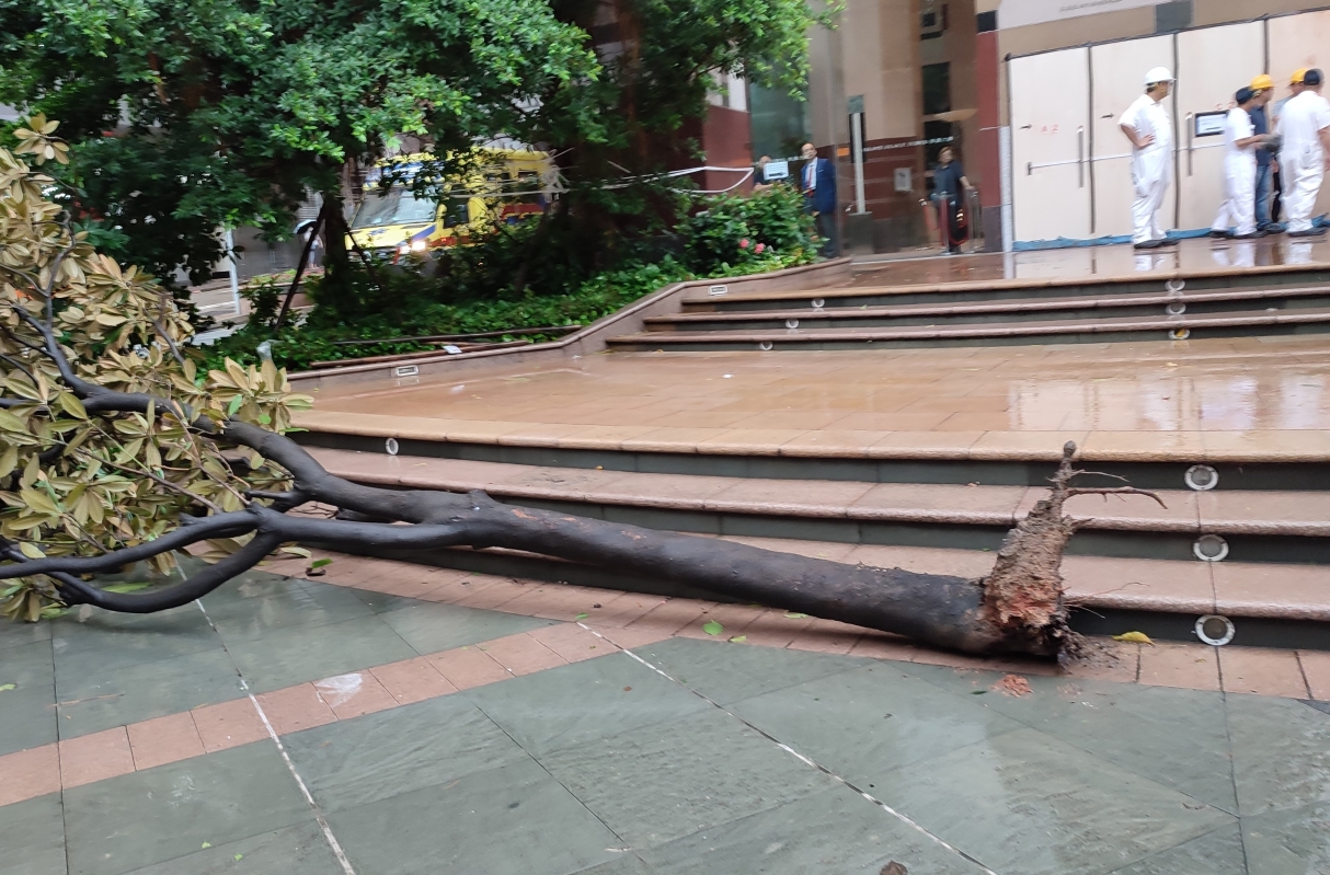 下午風勢增強,北角一處發生樹,狂風將一顆樹連根拔起。