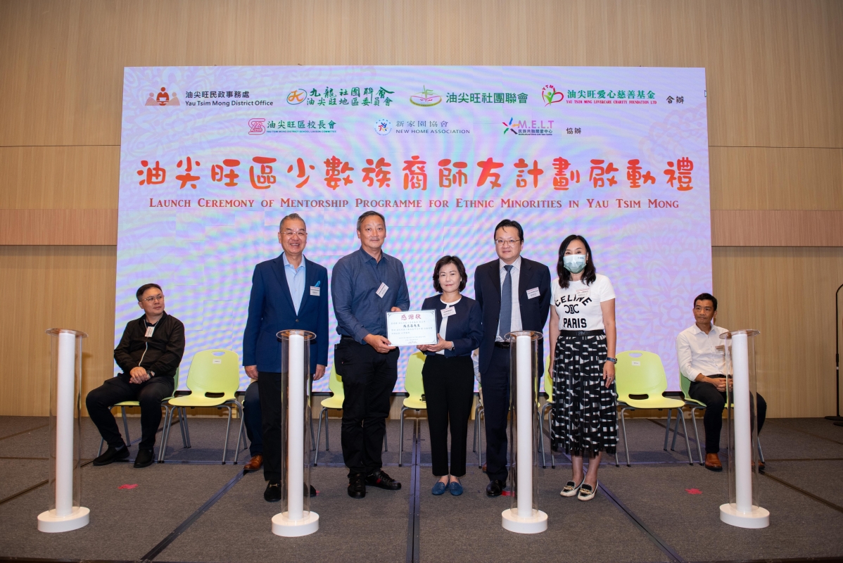“油尖旺區少數族裔師友計劃”啟動禮大合照。 九龍社團聯會油尖旺地區委員會主任楊子熙致歡迎辭時表示,感謝友師及學員對計劃的支持,期望學員積極參與計劃下的多元活動,並在友師指導下好好裝備自己,以正向態度定下並實踐個人目標,勇敢追求夢想。隨後,一眾主禮嘉賓到台上進行簡單而隆重的亮燈儀式,標誌著“油尖旺區少數族裔師友計劃”及一連串活動正式啟動,並由民政事務總署署長張趙凱渝向活動贊助人、油尖旺愛心慈善基金副主席馮志昌頒發感謝狀。
