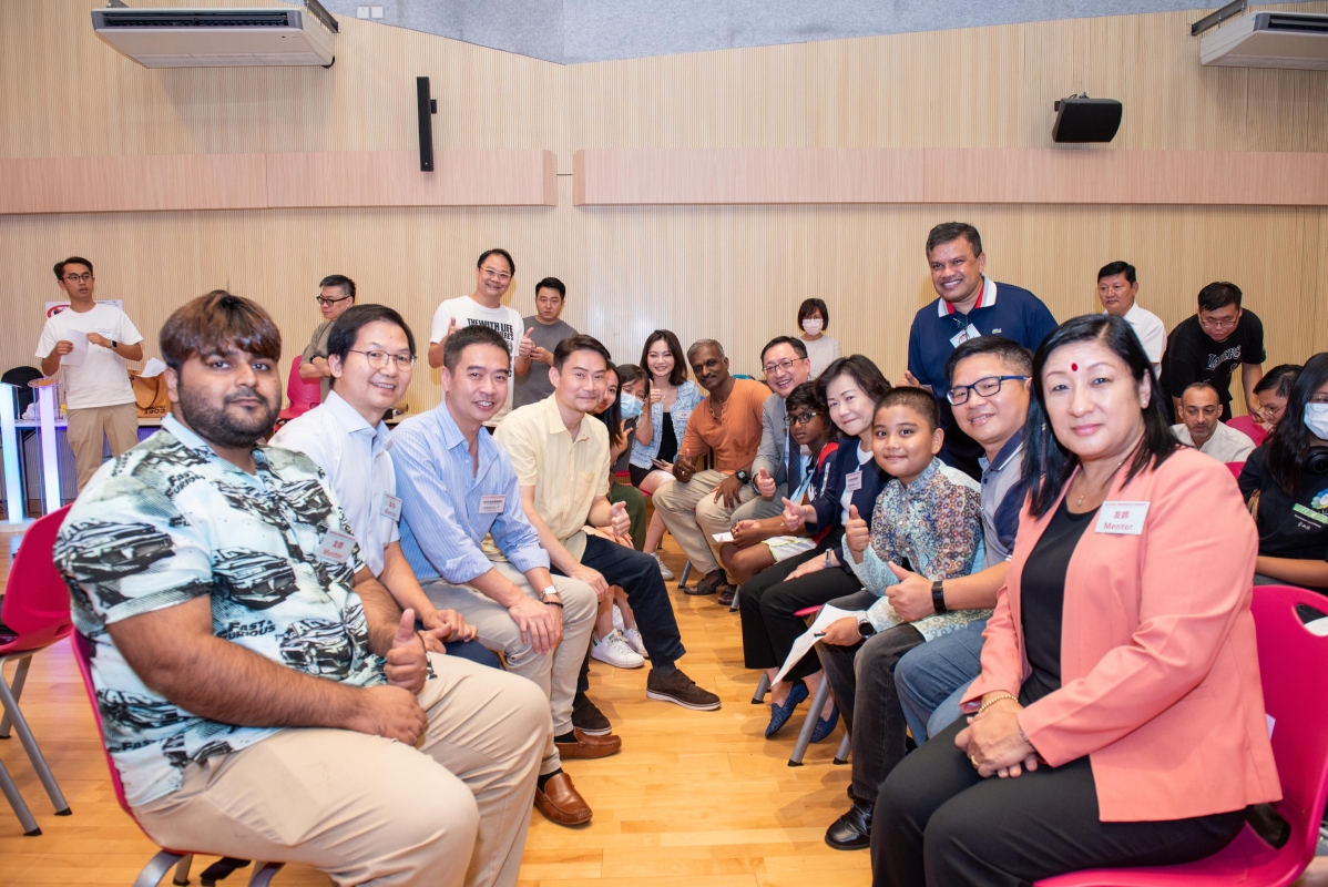 趙凱渝(右前4)及余健強(左前3)與計劃學員交流。 為體現對多元文化的尊重和欣賞,以及讓友師更深入地瞭解南亞文化,啟動禮上特別安排了南亞舞蹈體驗環節,讓一眾嘉賓、友師及學員共同學習尼泊爾及印度舞蹈,大家都非常投入參與,氣氛十分熱鬧。