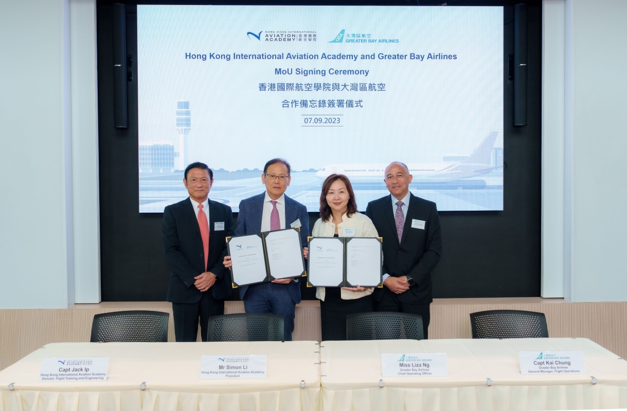 大灣區航空營運總裁吳秀蘭(右二)與香港國際航空學院校長李天柱(左二),在大灣區航空航務總經理鍾啟雲(右一)及香港國際航空學院飛行訓練及航空工程培訓中心總監葉欣鴻(左一)見證下,簽署合作備忘錄。 大灣區航空營運總裁吳秀蘭與香港國際航空學院校長李天柱,在大灣區航空航務總經理鍾啟雲機長及香港國際航空學院飛行訓練及航空工程培訓中心總監葉欣鴻見證下,簽署合作備忘錄。香港國際航空學院校長李天柱表示:“航空學院即將推出見習機師培訓課程,培育更多本地民航機師,以切合業界對機師的殷切需求。我們深感高興此課程獲多間本地航空公司大力支持,各參與的航空公司將向課程的學員提供面試機會,激勵有志成為機師的人才入行,進一步鞏固香港作為國際航空樞紐及培訓中心的地位。” 大灣區航空營運總裁吳秀蘭期待課程推出,並表示:“大灣區航空自去年7月啟航以來,飛行網絡不斷擴展。我們相信此課程能夠培育更多優秀機師,以配合大灣區航空增加航點及擴充機隊的計劃,從而滿足市場需求。” 根據是次合作備忘錄,大灣區航空將提供初步面試配對予香港國際航空學院的見習機師培訓課程學員,以及提供二副機師面試機會予課程畢業生。 大灣區航空於2022年7月啟航,現時提供往返曼谷、台北、首爾、東京、大阪及胡志明市的航班服務。詳情請瀏覽www.greaterbay-airlines.com。 【編輯:黃璇】