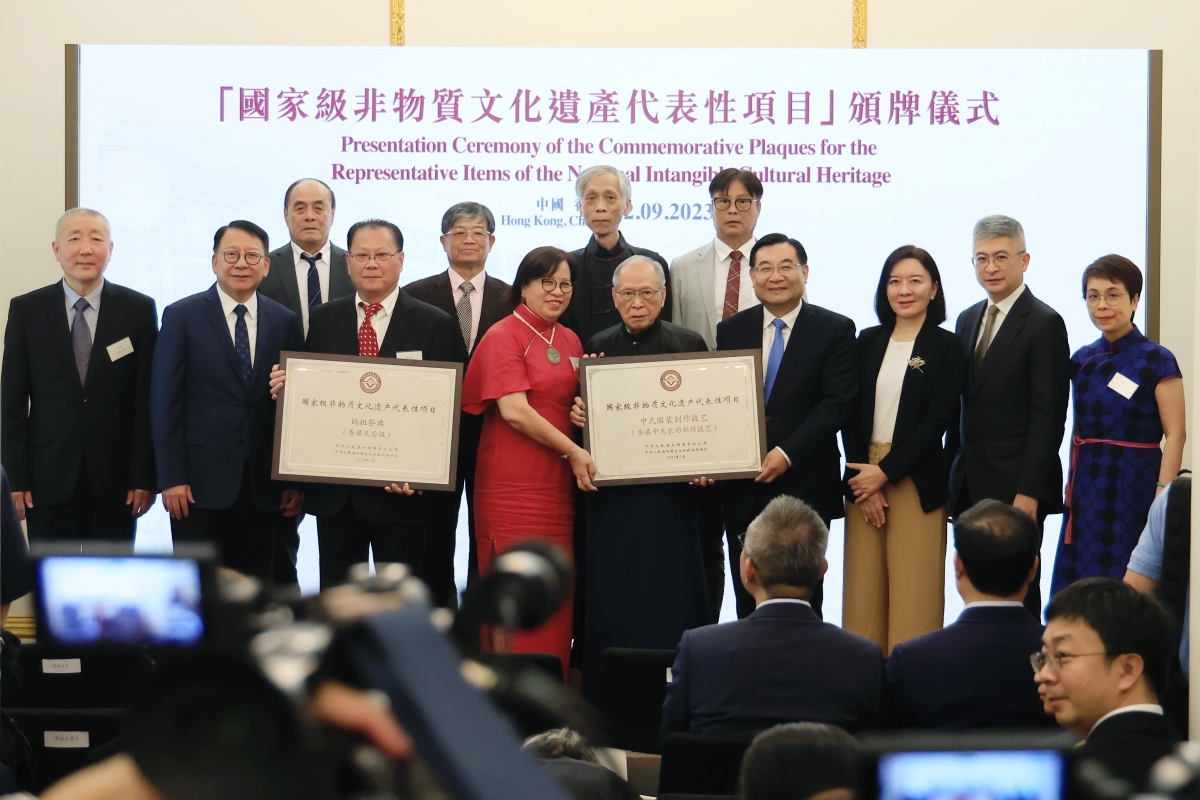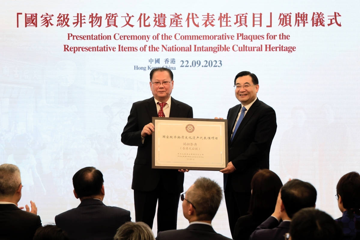 中國文化和旅遊部部長胡和平(右)22日在香港孫中山紀念館,分別向香港天后誕和香港中式長衫製作技藝兩個項目的保護單位,香港天后誕協會及香港長衫協會,頒發《國家級非物質文化遺產代表性項目名錄》牌匾。