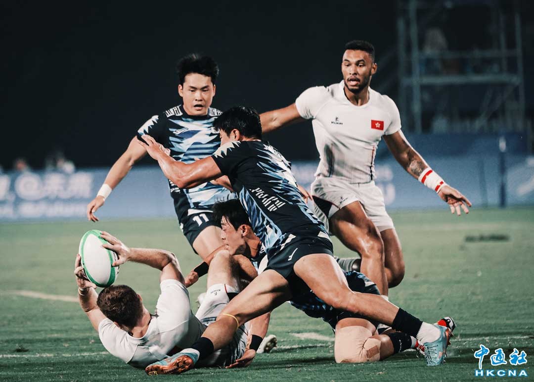 9月26日,杭州亞運會男子七人欖球決賽,中國香港橄欖球隊對壘韓國隊,經過激烈爭逐,最終香港隊14比7戰勝韓國奪得金牌。(香港中通社記者 洪少葵攝)