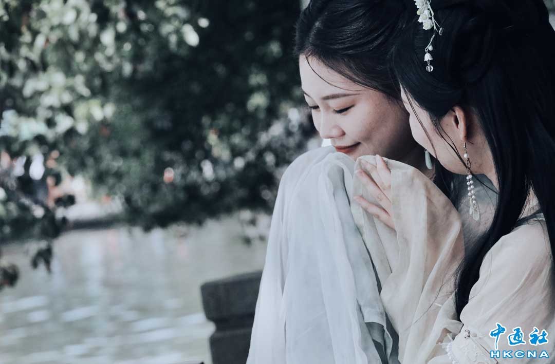 正在杭州舉行的亞運會如火如荼,杭州城更是熱鬧非凡,近期,年輕人風行的漢服穿著,成為鬧市裡的一道風景線。圖為9月29日中秋節,女生穿上各色各樣的漢服,吸引各地遊客目光。(香港中通社記者 洪少葵攝)