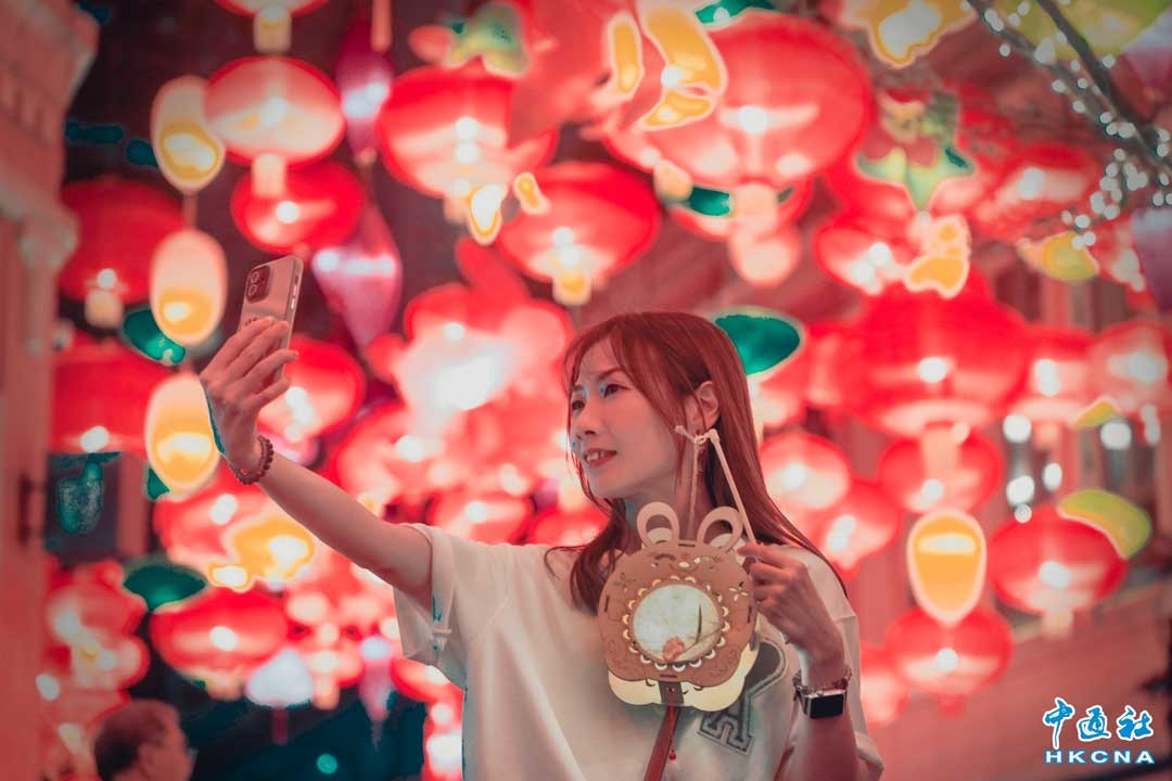 9月29日晚,香港利東街張燈結彩,不少市民與親朋好友一起歡度中秋夜。(香港中通社記者 許其皓攝)