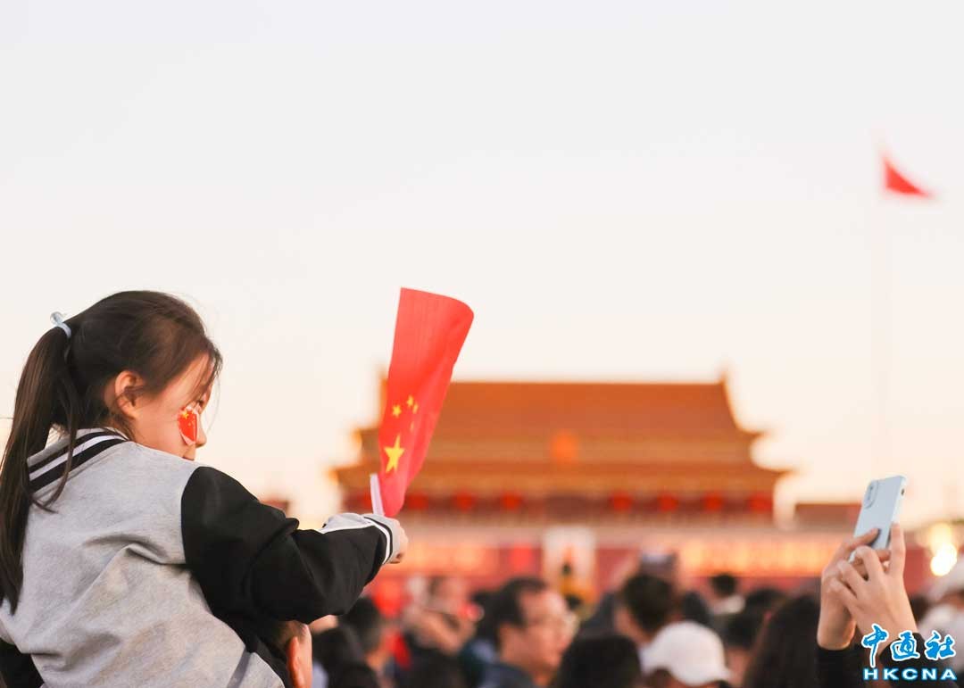 10月1日清晨,隆重的升國旗儀式在北京天安門廣場舉行,30.2萬市民遊客齊聚天安門廣場,共同見證五星紅旗冉冉升起的莊嚴時刻,慶祝新中國74周年華誕。圖為小朋友手持國旗在廣場拍照。 香港中通社圖片