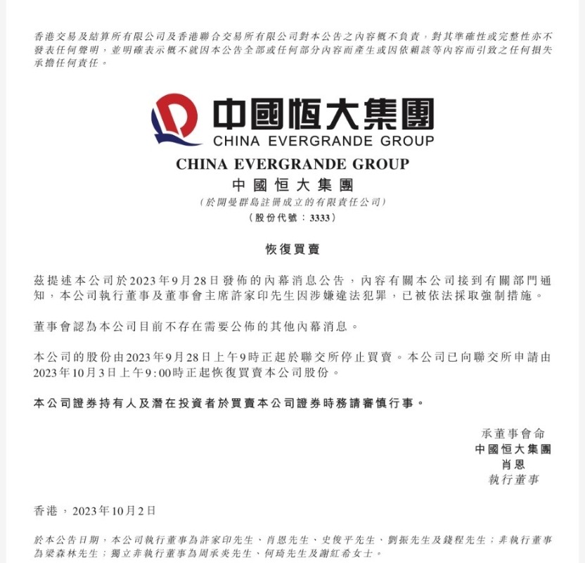 中國恒大公告 與此同時,恒大物業也發佈公告稱,公司董事會認為公司經營狀況正常,不存在需要公佈的其他內幕消息。公司已向香港聯交所申請由2023年10月3日上午9時恢復買賣公司股份。 截至發稿,恒大汽車尚未發佈復牌公告。 此前9月28日,中國恒大、恒大汽車、恒大物業在香港聯交所暫停交易。當天,中國恒大發佈公告稱,“本公司接到有關部門通知,本公司執行董事及董事會主席許家印因涉嫌違法犯罪,已被依法采取強制措施。” 就在公告前一天,9月27日午後,恒大系股價集體大跌。截至收盤,恒大汽車跌超20%,中國恒大、恒大物業分別下跌18.99%、14.49%。(完) 【編輯:林曉惠】
