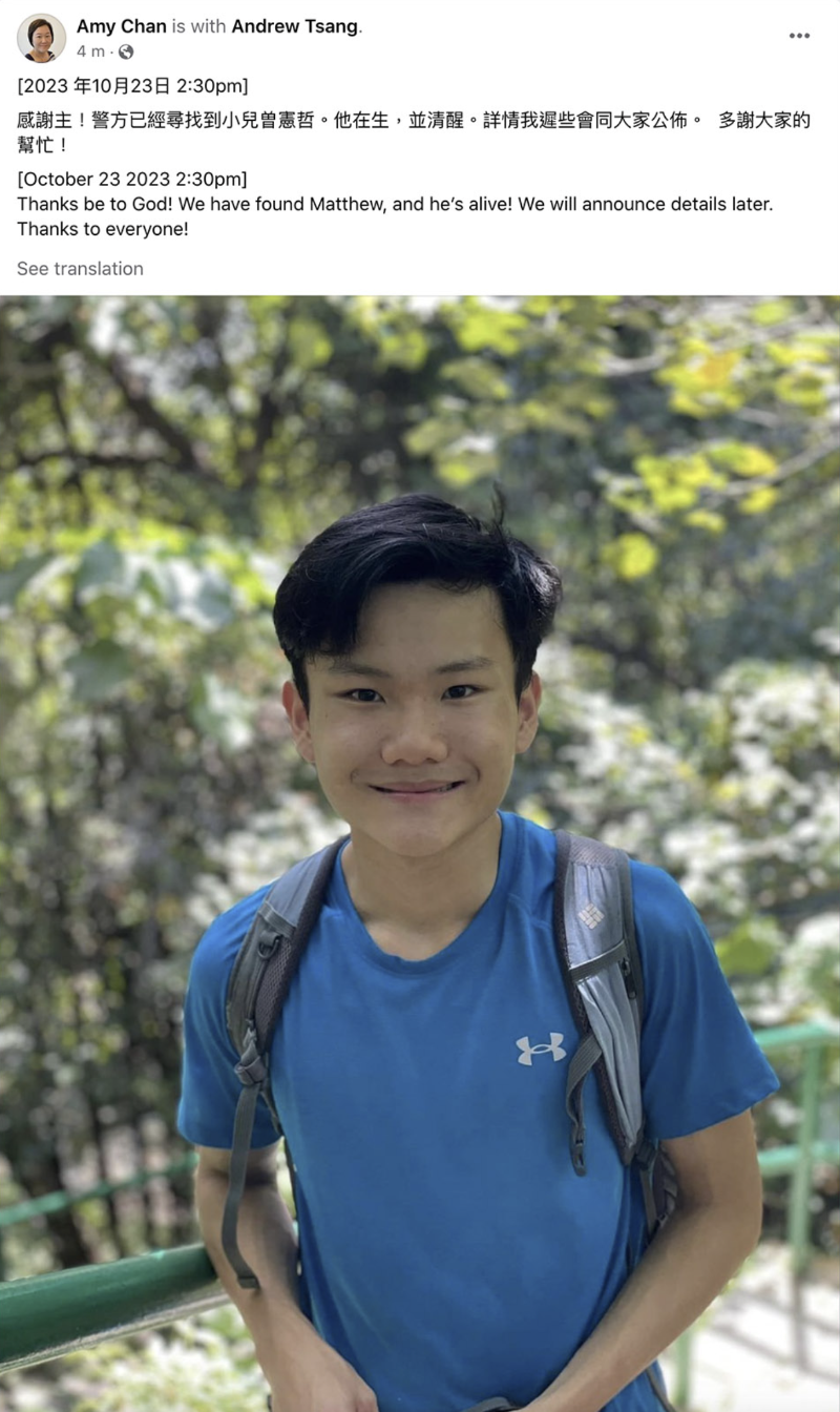 香港新聞網10月11日電 消息指,失蹤約一周的17歲拔萃男書院學生曾憲哲(Matthew),今日(11日)於馬鞍山郊野公園被尋回,無生命危險。他的母親在社交網站表示,兒子在生,並清醒,稍後家人會公布情況。