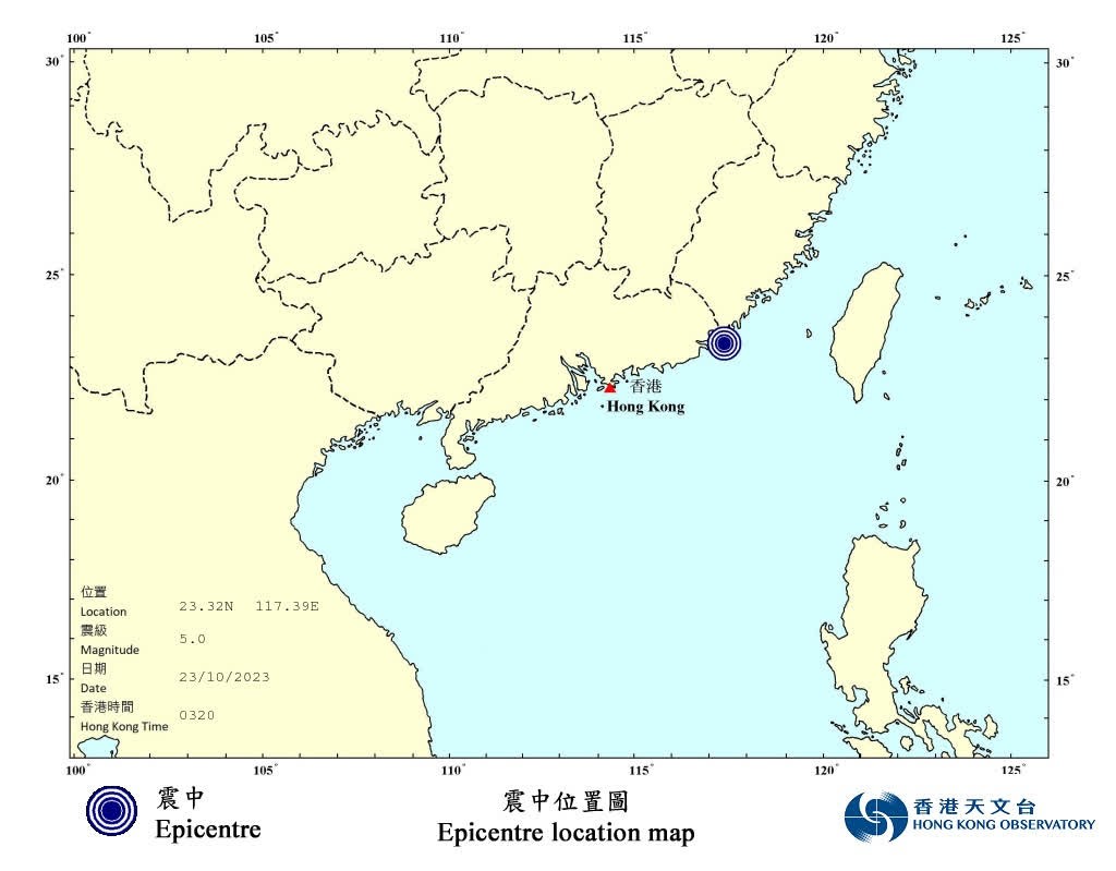 圖片來源:香港天文台 據香港天文台的初步分析,2023年10月23日(星期一)上午3時20分中國東南部近岸發生一次 5.0級地震,震中位於北緯23.32度,東經117.39度附近,即汕頭之東約71公里(即距離香港之東北偏東約350公里),震源深度約10公里。汕頭市地震局表示,暫時未收到傷亡和財產損失報告。 香港天文台接獲數名市民報告,表示感到輕微震動,震動維持數秒。初步分析顯示本港的地震烈度為修訂麥加利地震烈度表的第III (三)度,即室內有感,類似小型貨車駛過的振動。 【編輯:馮秋怡】