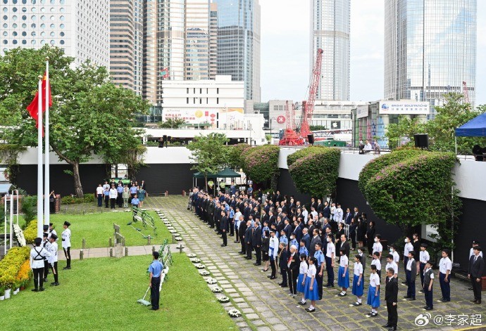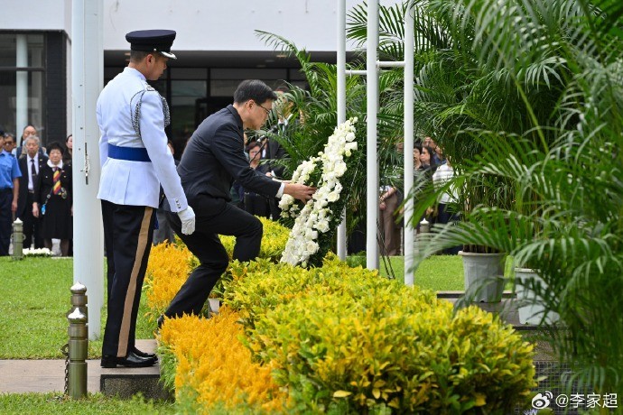 行政長官李家超致獻花圈 圖片來源:李家超微博 當天的香港大會堂紀念花園點綴了白色的鮮花,顯得莊嚴肅穆。儀式在早上8時舉行,現場先昇起國旗、區旗並奏唱國歌,其後出席嘉賓默哀2分鐘表達追思。行政長官李家超及出席儀式的不同代表,先後致獻花圈。 李家超表示,他獻上花圈向二戰英烈致以最崇高的敬意,永遠銘記於戰爭中壯烈犧牲的英靈和死難同胞。