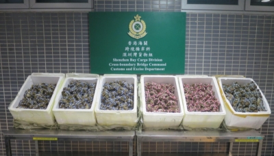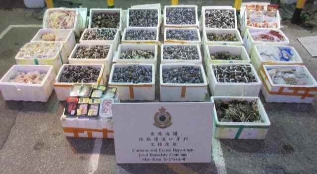 (香港中通社資料圖) 與此同時,香港海關破獲有紀錄以來最大宗懷疑走私大閘蟹案件,檢獲4萬8千只大閘蟹,重10.8噸,估計市值720萬港元。涉案的57歲男司機正被扣查。 海關落馬洲貨物及車輛處理組高級督察吳偉安表示,海關10月22日在一輛報稱載有307件電子產品的入境貨車上,檢獲該批懷疑走私大閘蟹,並未符有當地出口衛生證明書,不符合香港相關規定。本次發現大閘蟹的貨車無冷凍功能,只用發泡膠箱和尼龍繩包裹大閘蟹。關員檢獲時部分大閘蟹已死亡。此外,海關近月已檢獲14宗經私家車走私的大閘蟹案件。 海關表示,聯同食物安全中心自9月1日起,在海陸空口岸展開為期3個月的聯合行動,截至10月22日已轉介41宗同類案件予食安中心跟進,當中18宗案件無證據顯示涉案批次大閘蟹有相關衛生證明書,共涉及5萬5800只大閘蟹,共重12.2噸。