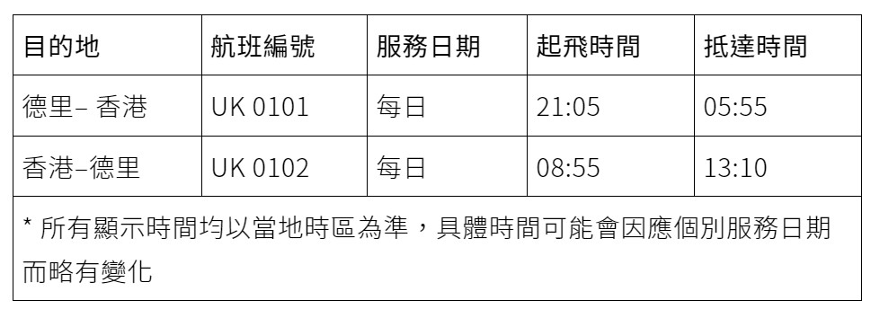 往返德里 / 香港航班時間表。 所有符合兩國政府簽證/入境規定的合資格乘客均可搭乘塔新航空的航班。塔新航空建議乘客在預訂航班前充分了解有關要求。 塔新航空行政總裁Vinod Kannan表示:“開辦印度直飛香港的航線,正是我們穩步拓展國際飛行網絡的最佳例證。香港作為全球首屈一指的商業樞紐,不僅是熱門的休閒旅遊熱門地點,亦吸引了大批來自印度的商務、MICE(會議、獎勵旅遊、大型會議、展覽業務)和VFR(探訪親友)旅客。我們很高興讓乘客有機會體驗印度優質的全方位航空公司,相信他們會對我們一流的產品和服務讚譽有加。”