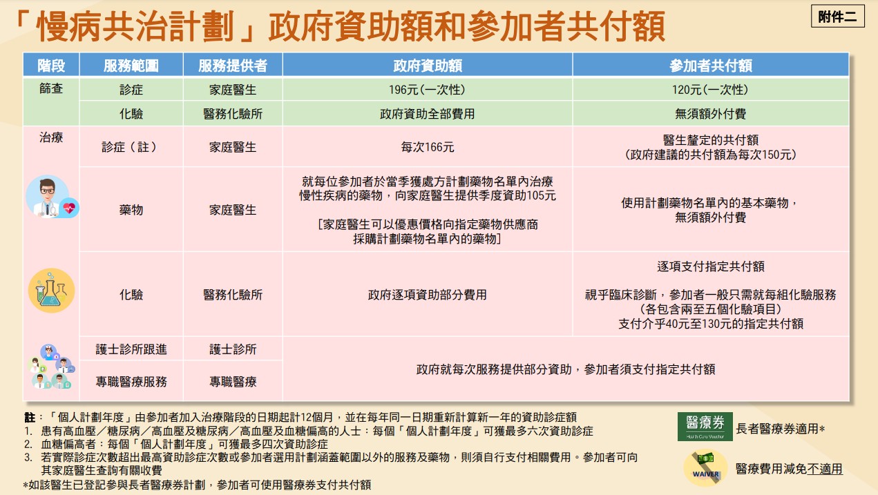 合資格人士將透過共付模式,自行負擔一定的共付額,並在政府資助下在私營醫療市場接受糖尿病和高血壓篩查、醫生診症和化驗,並按個人健康狀況獲處方藥物,接受護士診所和專職醫療服務跟進,65歲或以上人士,可用長者醫療券支付計劃的各項共付額。