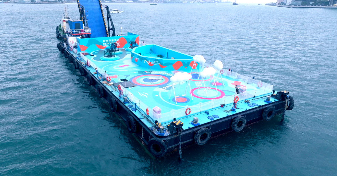 該海上遊樂場於大型船隻上搭建,兩周前已開始在柴灣公眾貨物裝卸區組裝,9日上午駛往尖沙咀海濱花園作最後準備。
