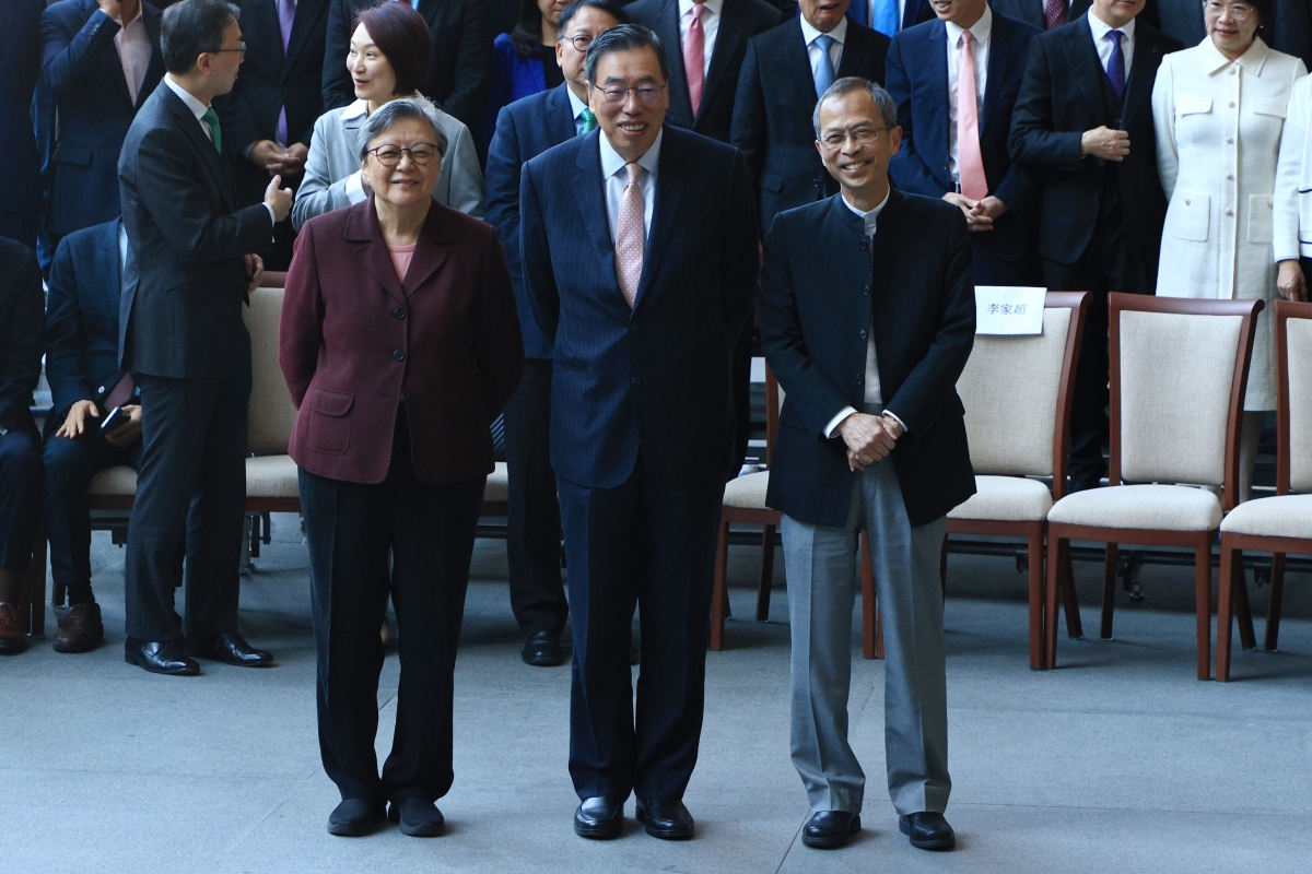 立法會主席梁君彥(中)與兩位立法會前主席范徐麗泰(左)和曾鈺成(右)出席午宴 【編輯:許其皓】