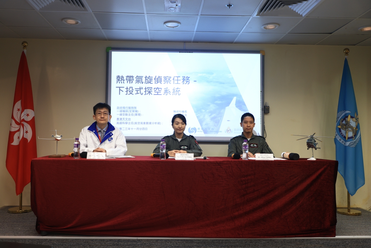 政府飛行服務隊一級機師陳綺玲(中)、政府飛行服務隊一級空勤主任曾志浩(右)和香港天文台高級科學主任張冰(左)出席記者會