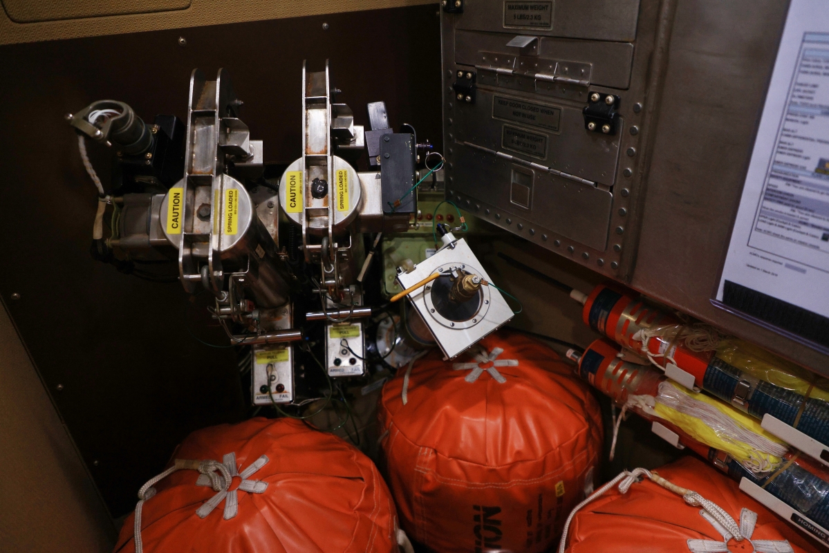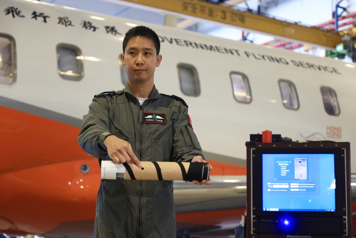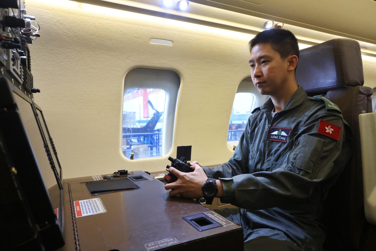 政府飛行服務隊一級空勤主任曾志浩於飛機上示範