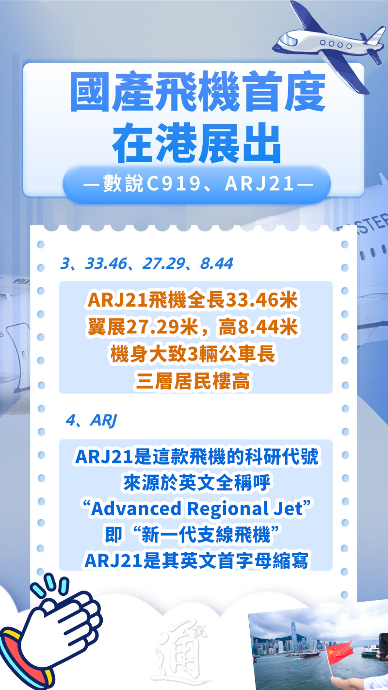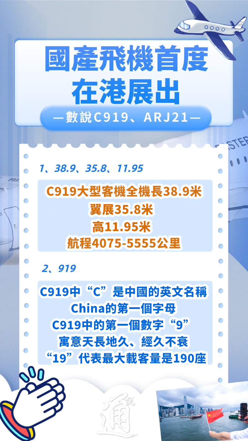 香港新聞網12月6日電 行政長官李家超5日宣布,兩架由國家自主研製的C919和ARJ21飛機,將於下周二至下周日,即12月12日至17日,首次到訪香港。他指,兩架飛機除會在機場進行靜態展示外,C919飛機亦將於下周六(16日)在維港上空進行飛行演示,讓市民見證首次翱翔香港上空的一刻。兩架飛機為何取名C919和ARJ21?性能如何?戳圖了解!