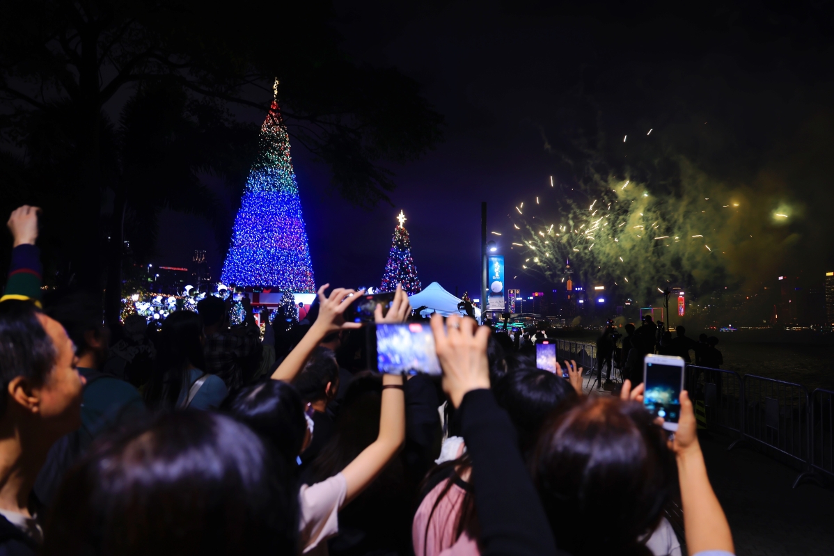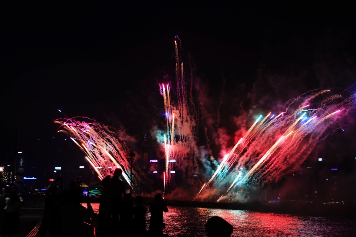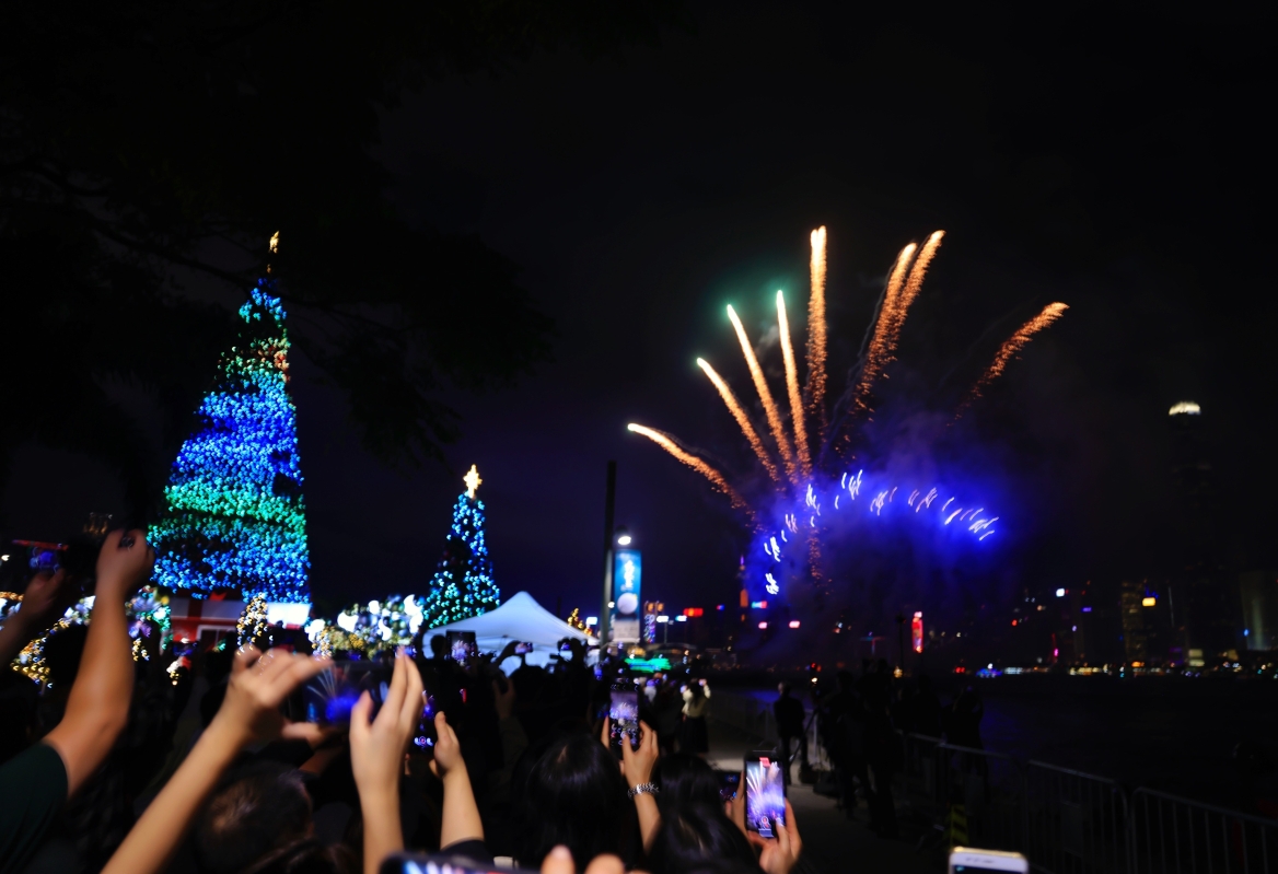 “冬日維港水上煙火”在維港夜空中上演,吸引眾多遊人和市民觀看