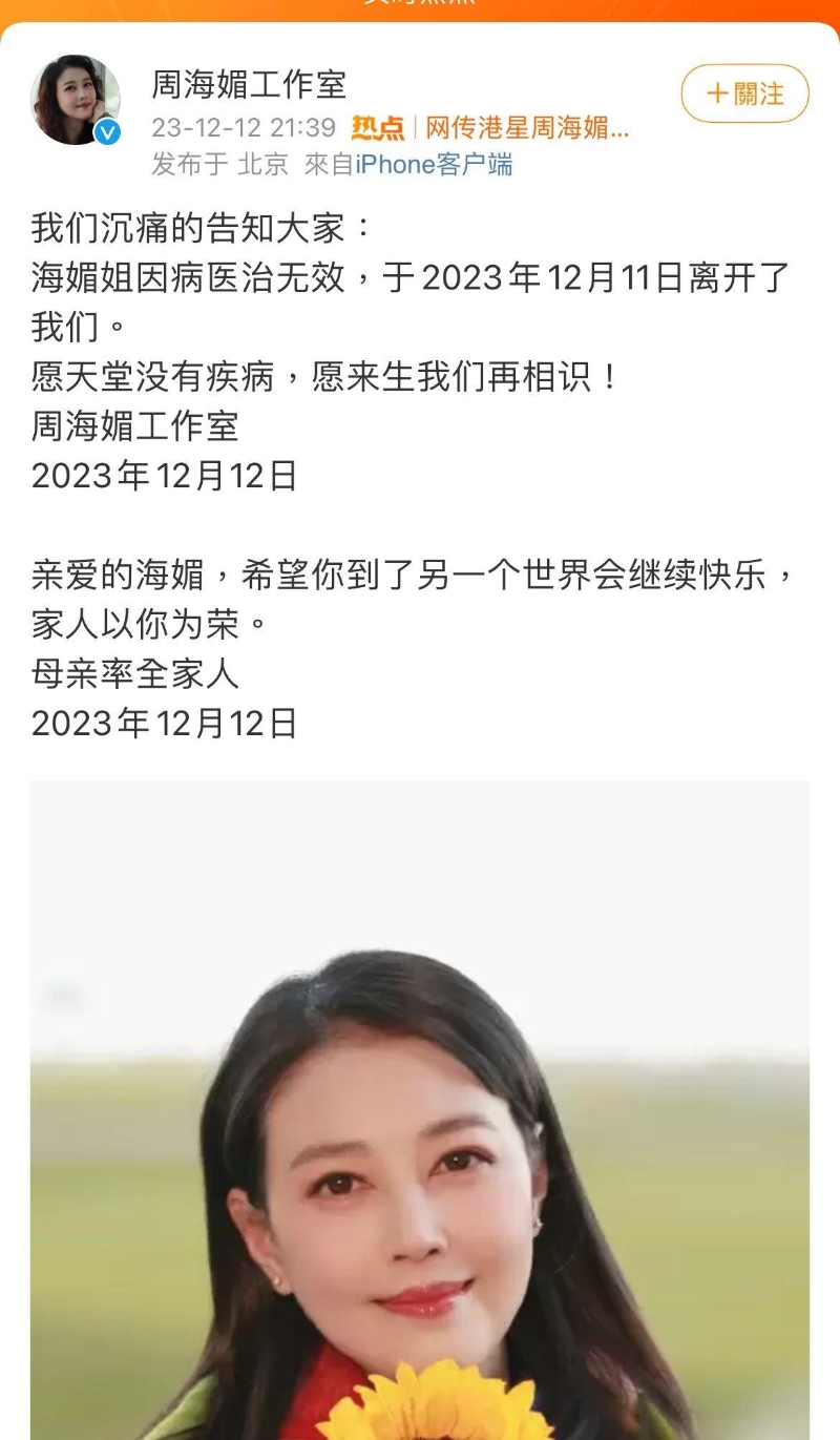 香港新聞網12月12日電 周海媚工作室12日晚間透過微博發文宣佈,周海媚12月11日已離開人世,終年57歲。