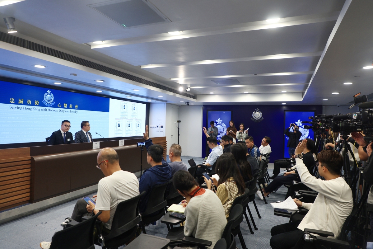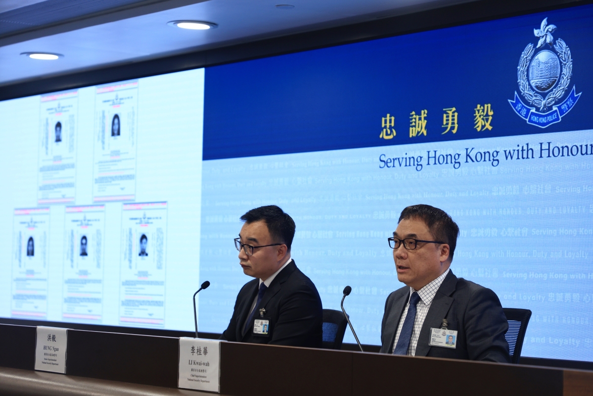 香港警務處國家安全處總警司李桂華(右)及香港警務處國家安全處高級警司洪毅出席記者會