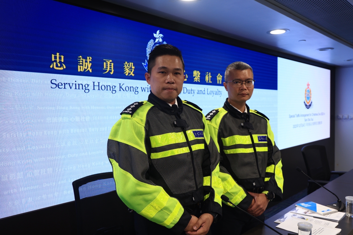 西九龍總區交通部執行及管制組署理總督察雲錦鋒(左)及港島總區交通部執行及管制組署理總督察鄭耀嵐(右)出席記者會
