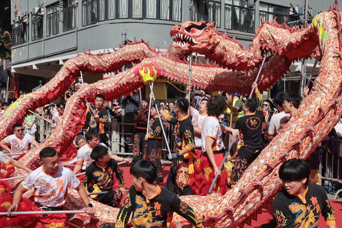 香港新聞網12月31日電(記者 謝光磊 )12月31日,大角咀廟會於香港大角咀福全街舉行,廟會大巡遊為活動揭開序幕。全天的廟會設置巡遊、表演、美食攤位等,吸引眾多市民及中外遊客,一起慶祝新年到來。大角咀廟會的特色活動包括早上的廟會巡遊,下午的十八醒獅梅花樁表演及晚上壓軸的夜光龍表演。除了欣賞演出外,你還有機會免費品嚐千人盆菜晚宴。