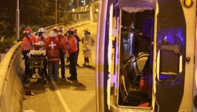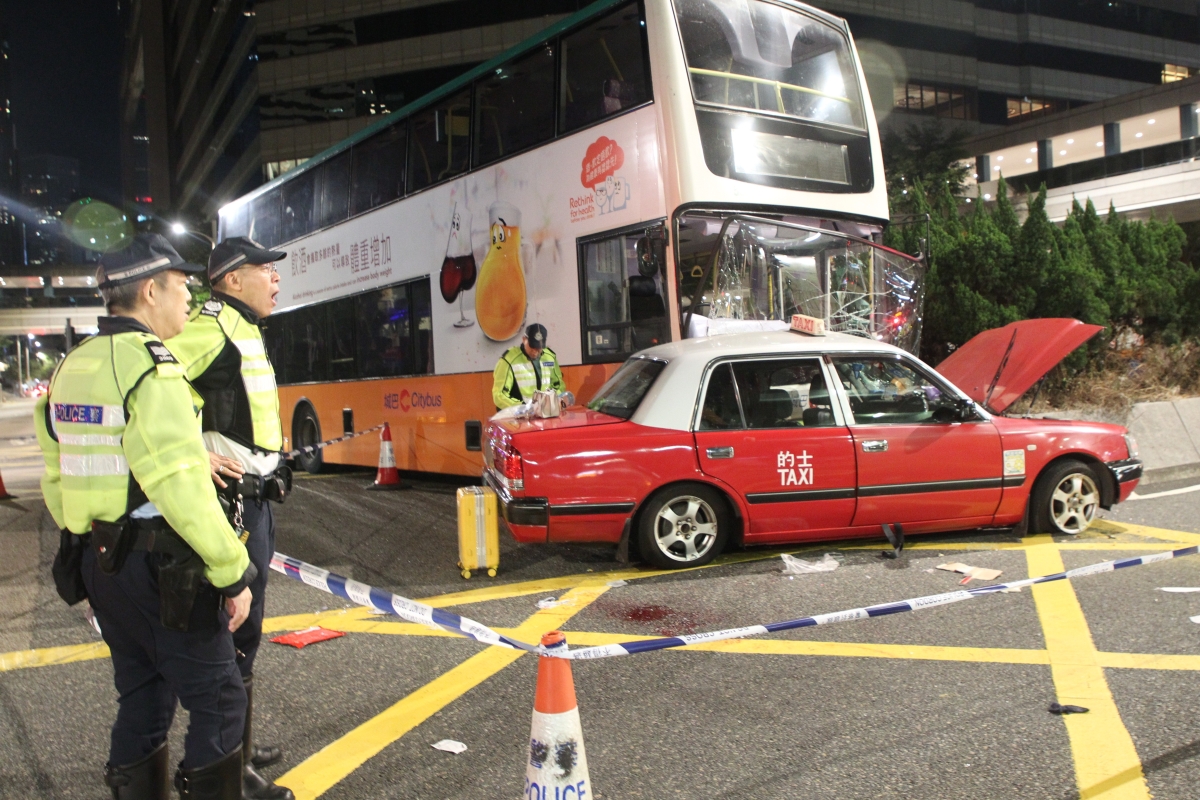 香港新聞網1月14日電(記者洪少葵)114日晚上約9時半,行駛中的一輛的士與一輛城巴在灣仔港灣道與菲林明道交界相撞,現場消息指,的士上一男一女乘客重傷昏迷,女乘客其後傷重不治。的士女司機則受傷清醒送醫院。警方在事故現場處理。涉事的士車身嚴重損毀,巴士車頭玻璃碎裂,現場遺下一個手袋和行李箱