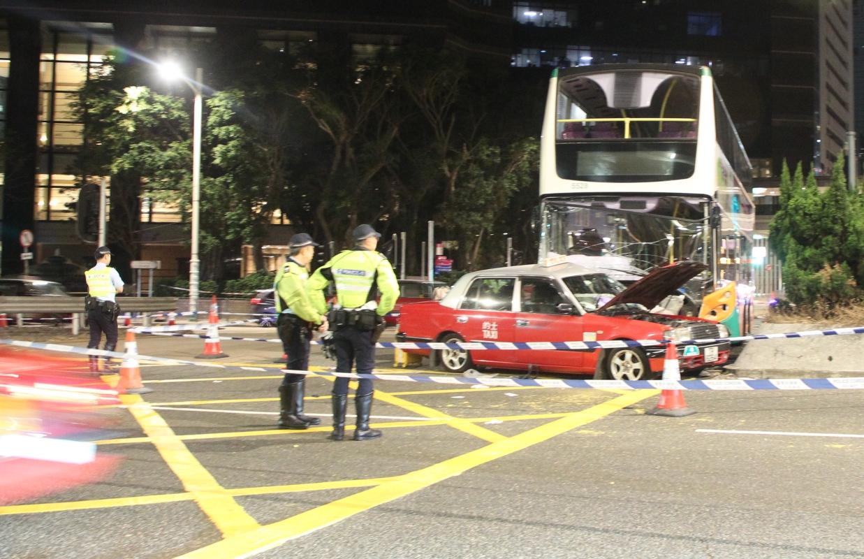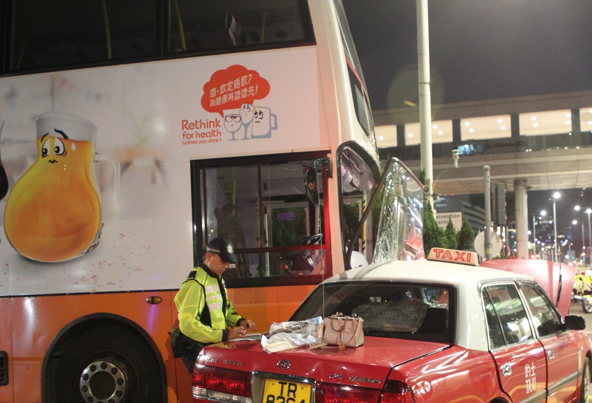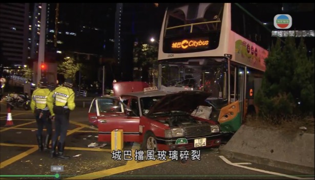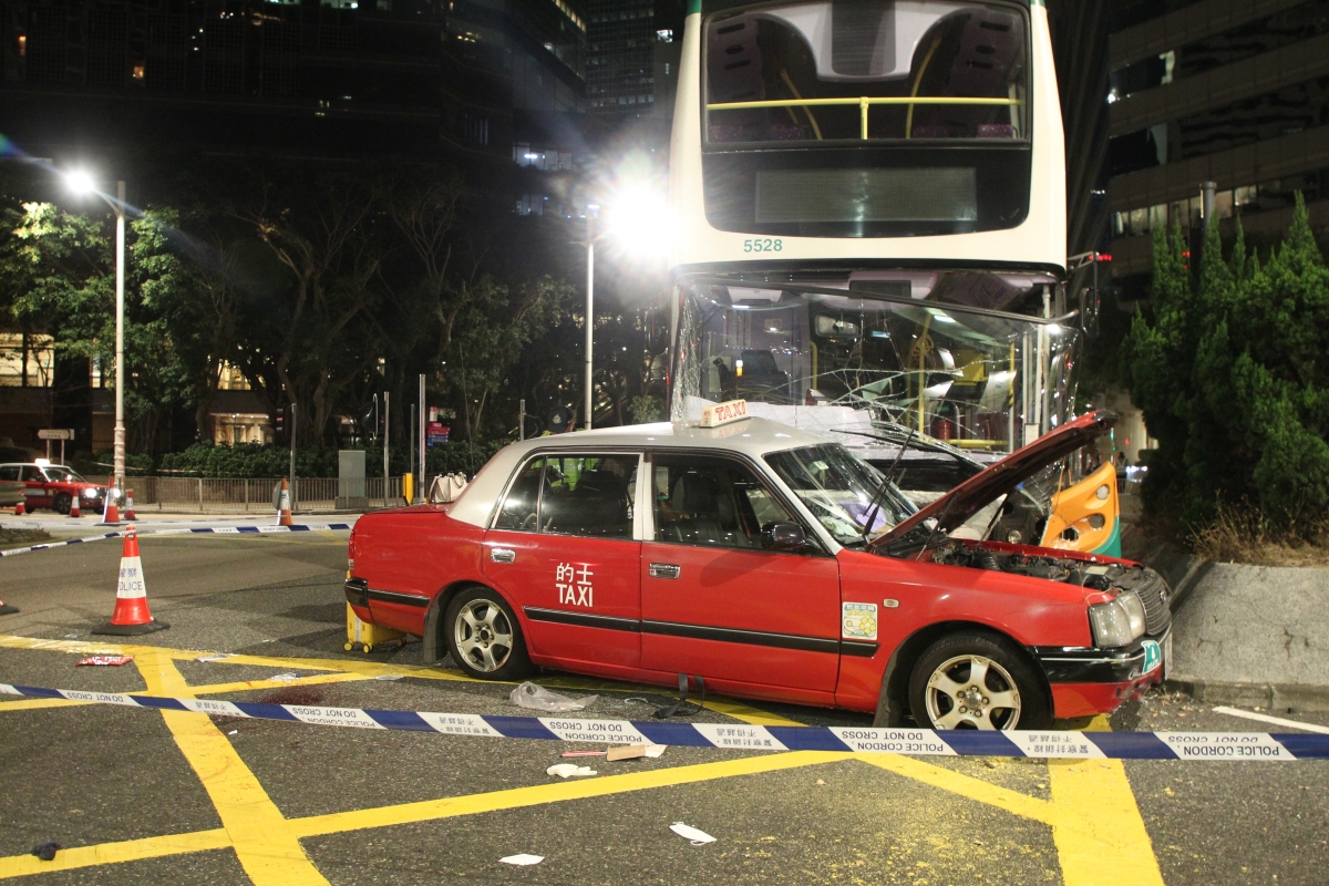 行駛中的一輛的士與一輛城巴在灣仔港灣道與菲林明道交界相撞