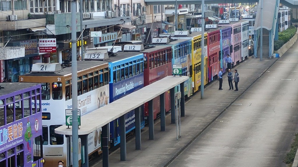 堵車堵出別樣風景?香港電車排隊似彩虹牆