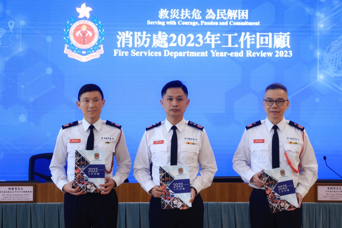 香港新聞網2月1日電(記者許其皓) 2月1日,香港消防處舉行年終回顧記者會,簡報消防處在2023年的工作和未來的計劃。消防處處長楊恩健(中)、消防處副處長(行動)黃鎮業及消防處副處長(公眾安全及機構策略)陳慶勇出席記者會。